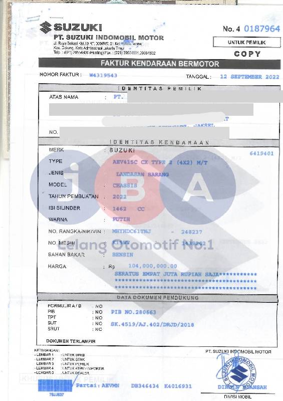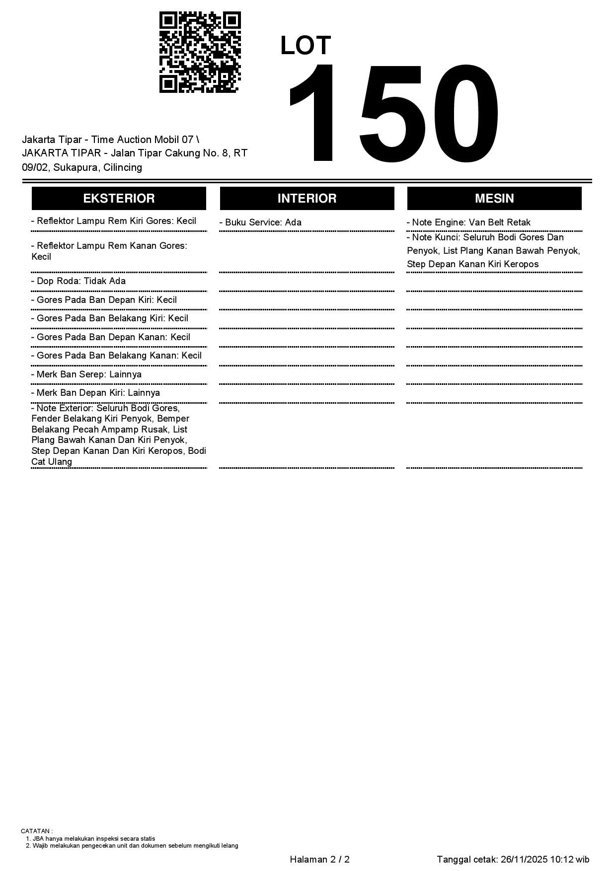 - Kondisi objek lelang dilelang apa adanya, baik kondisi fisik, mesin maupun legalitas kendaraan. Jika terdapat kekurangan/cacat baik yang terlihat maupun yang tidak terlihat, maka semua akan menjadi tanggung jawab/risiko Pemenang Lelang. Oleh karena itu, Pemenang Lelang melepaskan segala hak untuk menuntut dan/atau meminta ganti rugi atas hal tersebut kepada JBA.