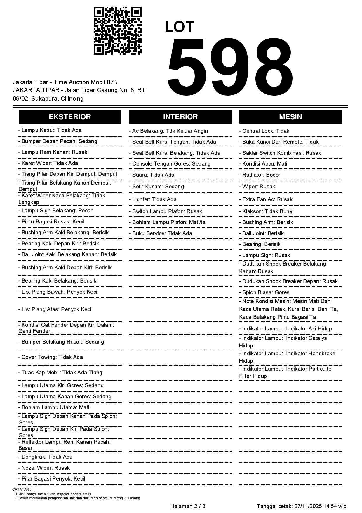 - Kondisi objek lelang dilelang apa adanya, baik kondisi fisik, mesin maupun legalitas kendaraan. Jika terdapat kekurangan/cacat baik yang terlihat maupun yang tidak terlihat, maka semua akan menjadi tanggung jawab/risiko Pemenang Lelang. Oleh karena itu, Pemenang Lelang melepaskan segala hak untuk menuntut dan/atau meminta ganti rugi atas hal tersebut kepada JBA.
