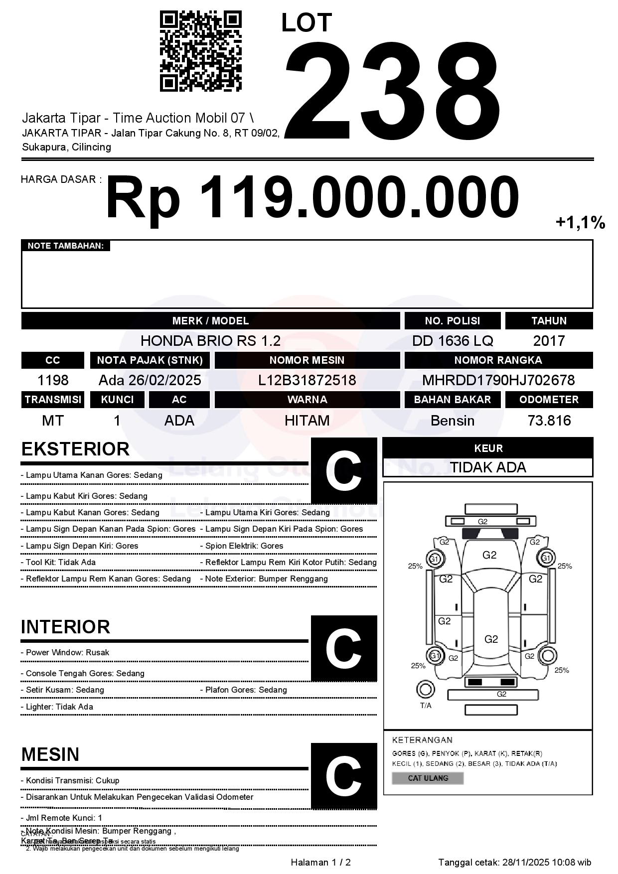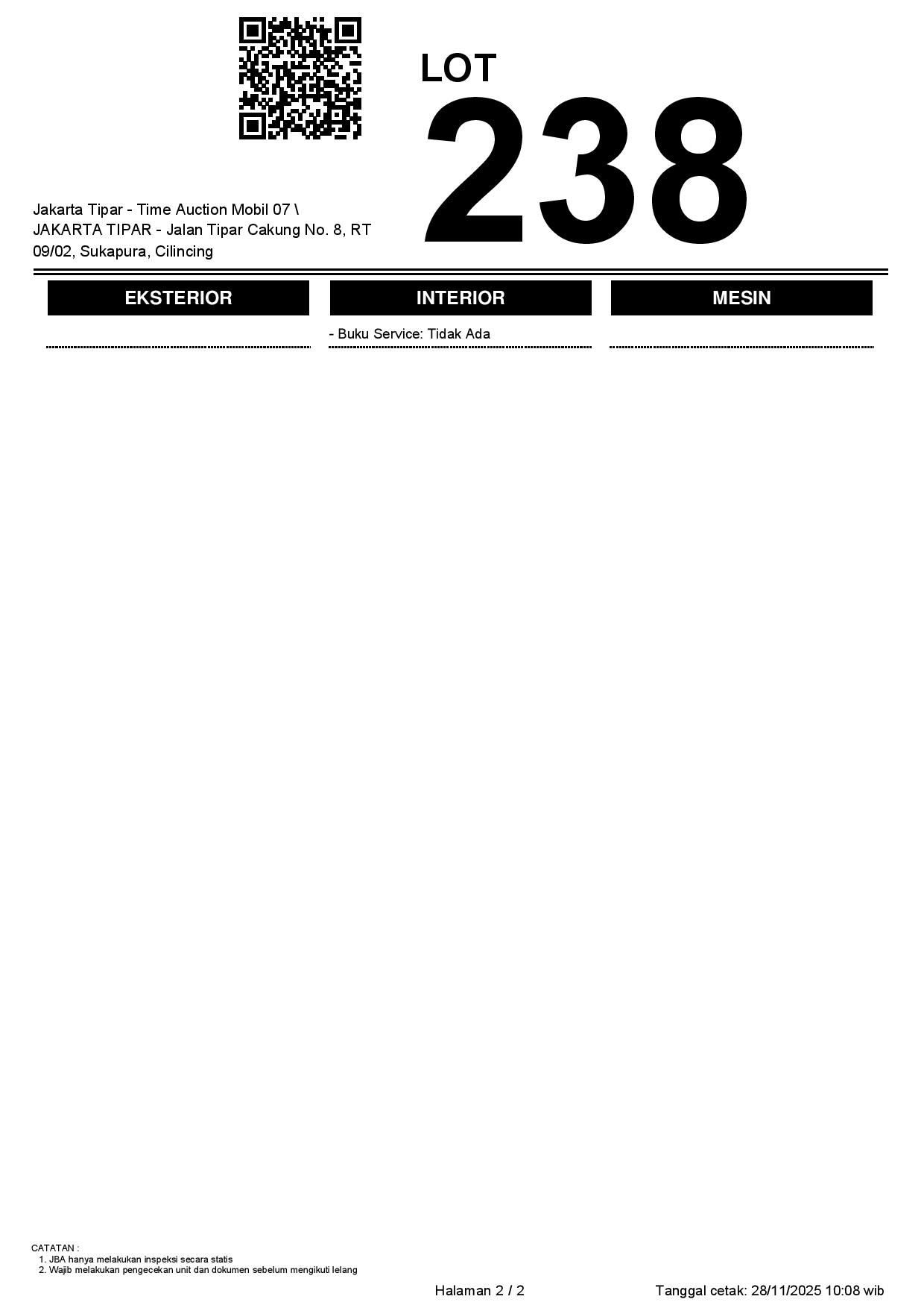 - Kondisi objek lelang dilelang apa adanya, baik kondisi fisik, mesin maupun legalitas kendaraan. Jika terdapat kekurangan/cacat baik yang terlihat maupun yang tidak terlihat, maka semua akan menjadi tanggung jawab/risiko Pemenang Lelang. Oleh karena itu, Pemenang Lelang melepaskan segala hak untuk menuntut dan/atau meminta ganti rugi atas hal tersebut kepada JBA.