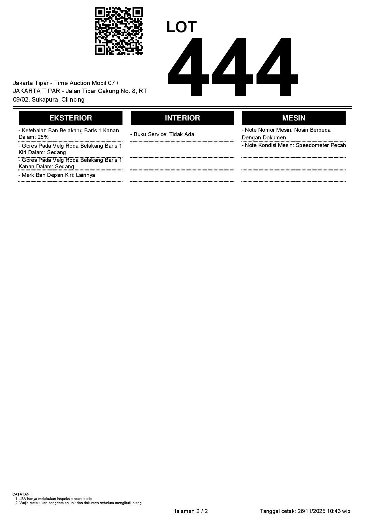 - Kondisi objek lelang dilelang apa adanya, baik kondisi fisik, mesin maupun legalitas kendaraan. Jika terdapat kekurangan/cacat baik yang terlihat maupun yang tidak terlihat, maka semua akan menjadi tanggung jawab/risiko Pemenang Lelang. Oleh karena itu, Pemenang Lelang melepaskan segala hak untuk menuntut dan/atau meminta ganti rugi atas hal tersebut kepada JBA.