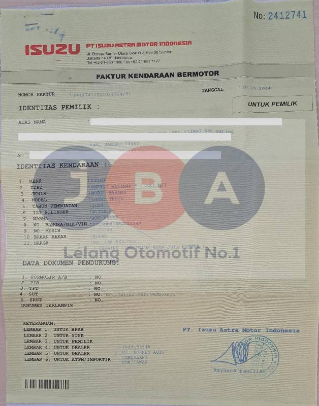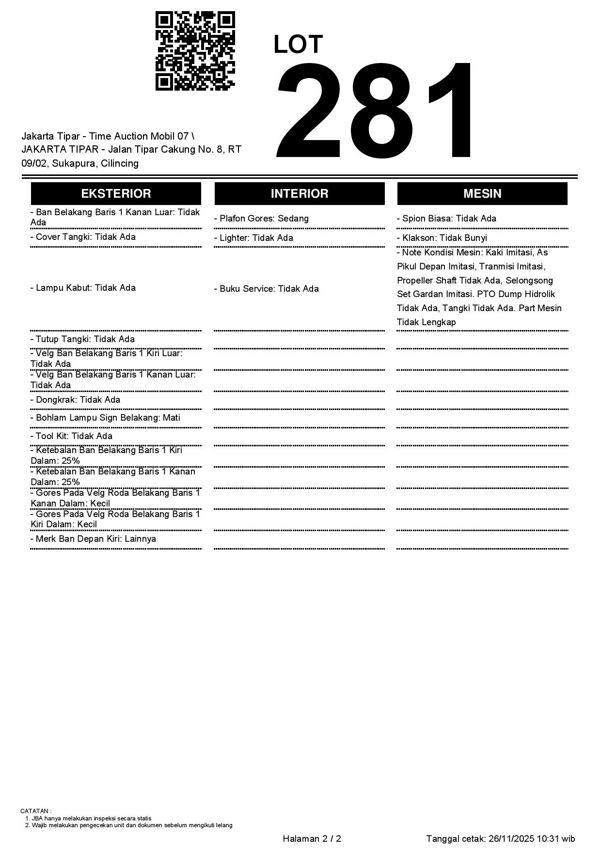 - Kondisi objek lelang dilelang apa adanya, baik kondisi fisik, mesin maupun legalitas kendaraan. Jika terdapat kekurangan/cacat baik yang terlihat maupun yang tidak terlihat, maka semua akan menjadi tanggung jawab/risiko Pemenang Lelang. Oleh karena itu, Pemenang Lelang melepaskan segala hak untuk menuntut dan/atau meminta ganti rugi atas hal tersebut kepada JBA.