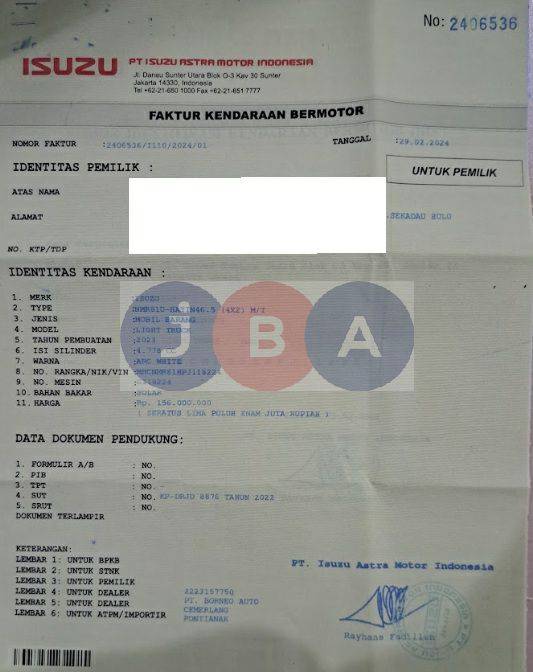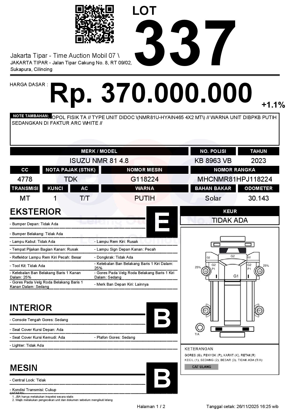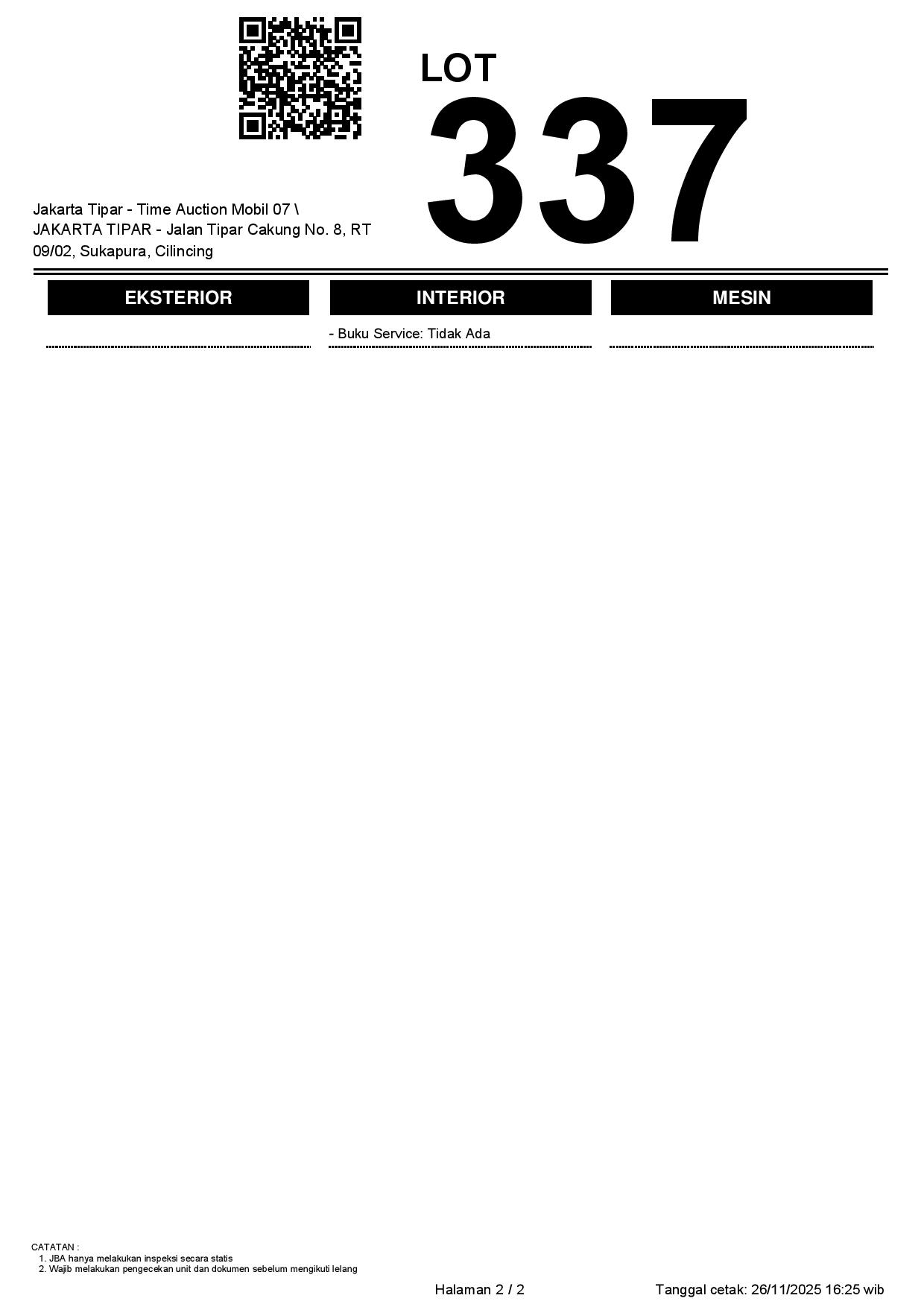 - Kondisi objek lelang dilelang apa adanya, baik kondisi fisik, mesin maupun legalitas kendaraan. Jika terdapat kekurangan/cacat baik yang terlihat maupun yang tidak terlihat, maka semua akan menjadi tanggung jawab/risiko Pemenang Lelang. Oleh karena itu, Pemenang Lelang melepaskan segala hak untuk menuntut dan/atau meminta ganti rugi atas hal tersebut kepada JBA.