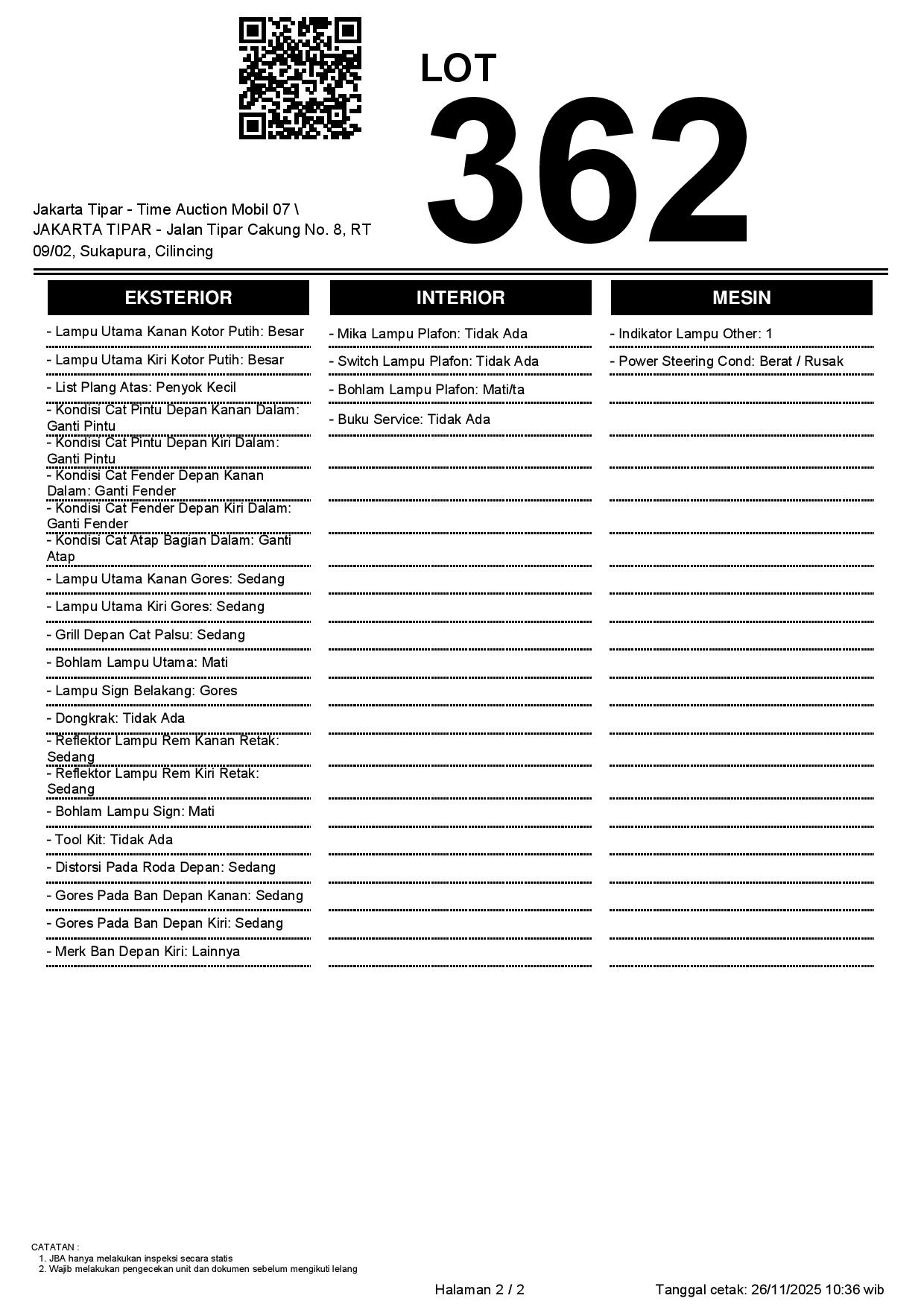 - Kondisi objek lelang dilelang apa adanya, baik kondisi fisik, mesin maupun legalitas kendaraan. Jika terdapat kekurangan/cacat baik yang terlihat maupun yang tidak terlihat, maka semua akan menjadi tanggung jawab/risiko Pemenang Lelang. Oleh karena itu, Pemenang Lelang melepaskan segala hak untuk menuntut dan/atau meminta ganti rugi atas hal tersebut kepada JBA.