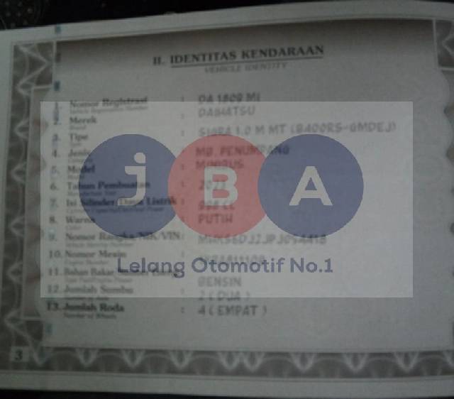 - Kondisi objek lelang dilelang apa adanya, baik kondisi fisik, mesin maupun legalitas kendaraan. Jika terdapat kekurangan/cacat baik yang terlihat maupun yang tidak terlihat, maka semua akan menjadi tanggung jawab/risiko Pemenang Lelang. Oleh karena itu, Pemenang Lelang melepaskan segala hak untuk menuntut dan/atau meminta ganti rugi atas hal tersebut kepada JBA.