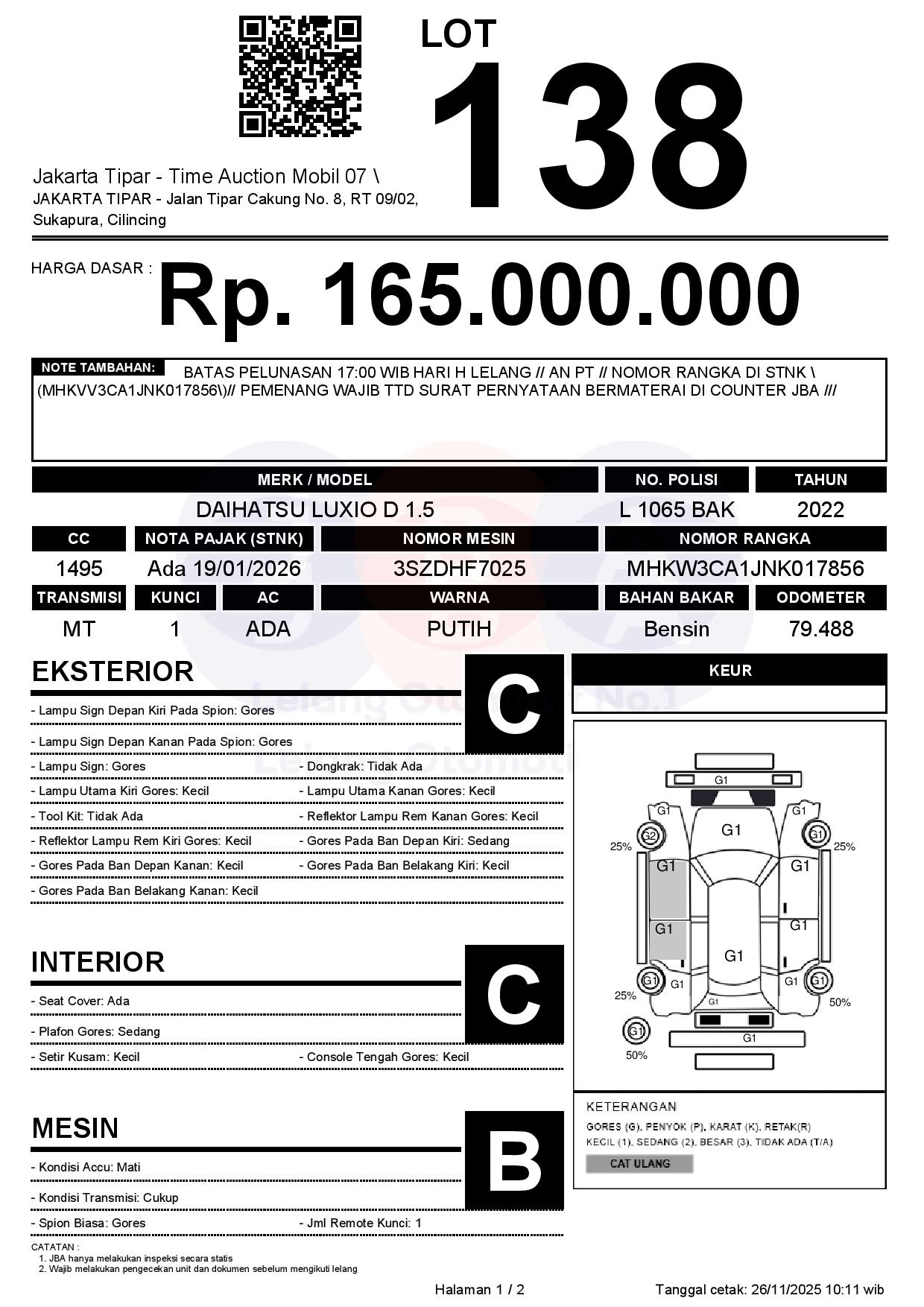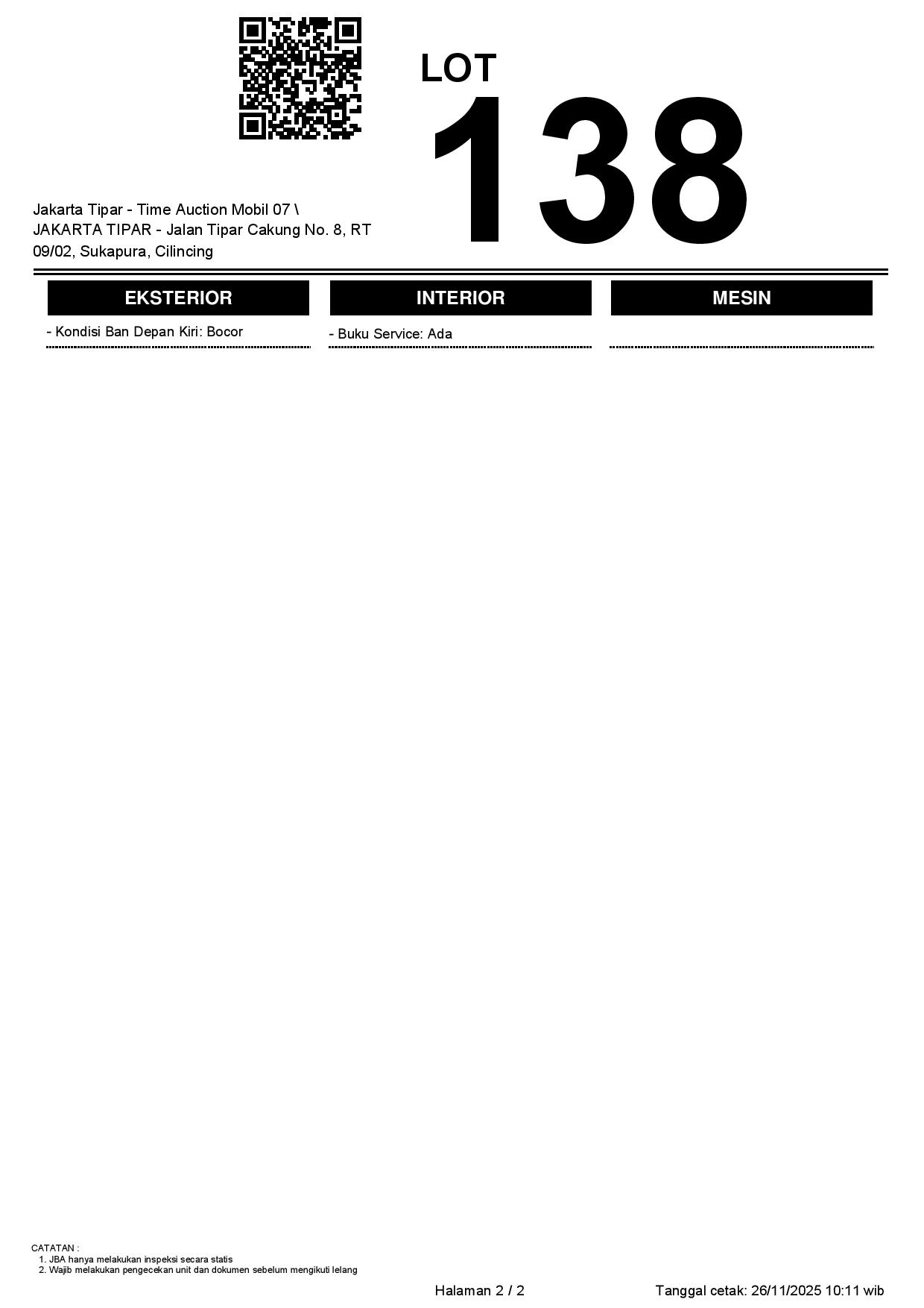 - Kondisi objek lelang dilelang apa adanya, baik kondisi fisik, mesin maupun legalitas kendaraan. Jika terdapat kekurangan/cacat baik yang terlihat maupun yang tidak terlihat, maka semua akan menjadi tanggung jawab/risiko Pemenang Lelang. Oleh karena itu, Pemenang Lelang melepaskan segala hak untuk menuntut dan/atau meminta ganti rugi atas hal tersebut kepada JBA.