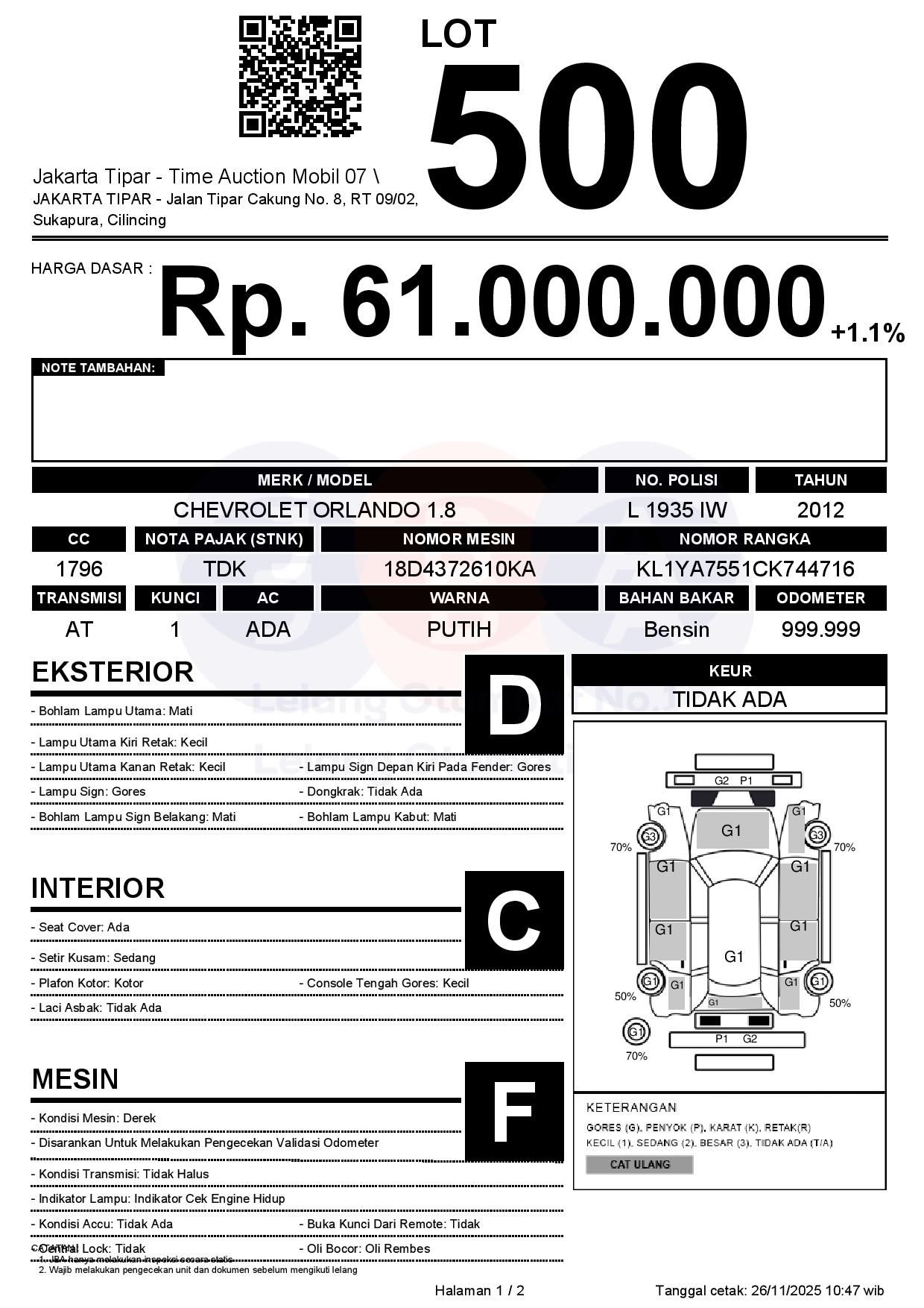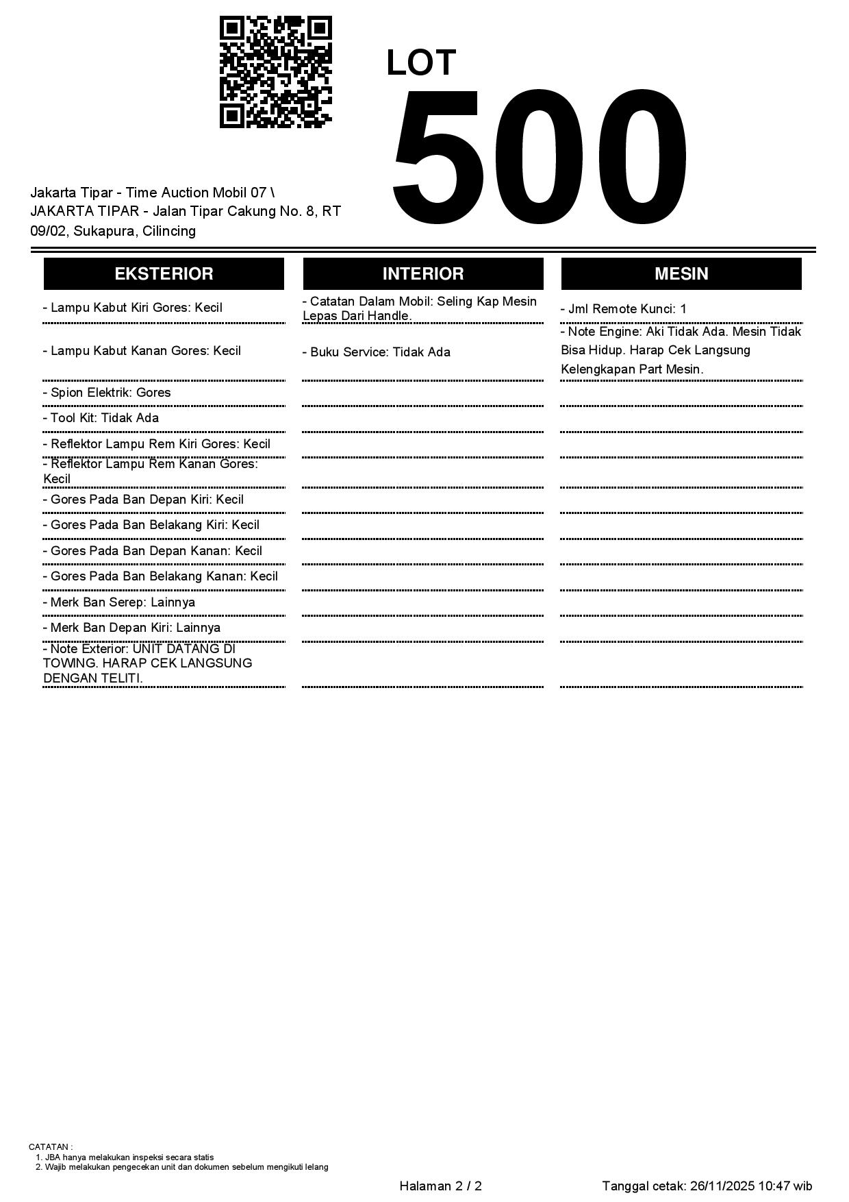 - Kondisi objek lelang dilelang apa adanya, baik kondisi fisik, mesin maupun legalitas kendaraan. Jika terdapat kekurangan/cacat baik yang terlihat maupun yang tidak terlihat, maka semua akan menjadi tanggung jawab/risiko Pemenang Lelang. Oleh karena itu, Pemenang Lelang melepaskan segala hak untuk menuntut dan/atau meminta ganti rugi atas hal tersebut kepada JBA.