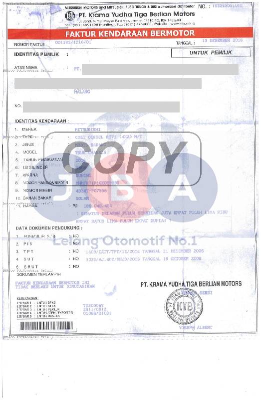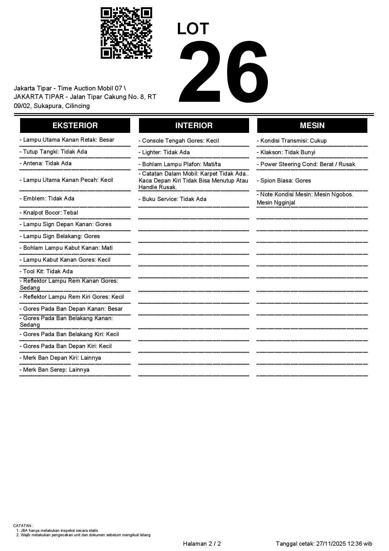 - Kondisi objek lelang dilelang apa adanya, baik kondisi fisik, mesin maupun legalitas kendaraan. Jika terdapat kekurangan/cacat baik yang terlihat maupun yang tidak terlihat, maka semua akan menjadi tanggung jawab/risiko Pemenang Lelang. Oleh karena itu, Pemenang Lelang melepaskan segala hak untuk menuntut dan/atau meminta ganti rugi atas hal tersebut kepada JBA.