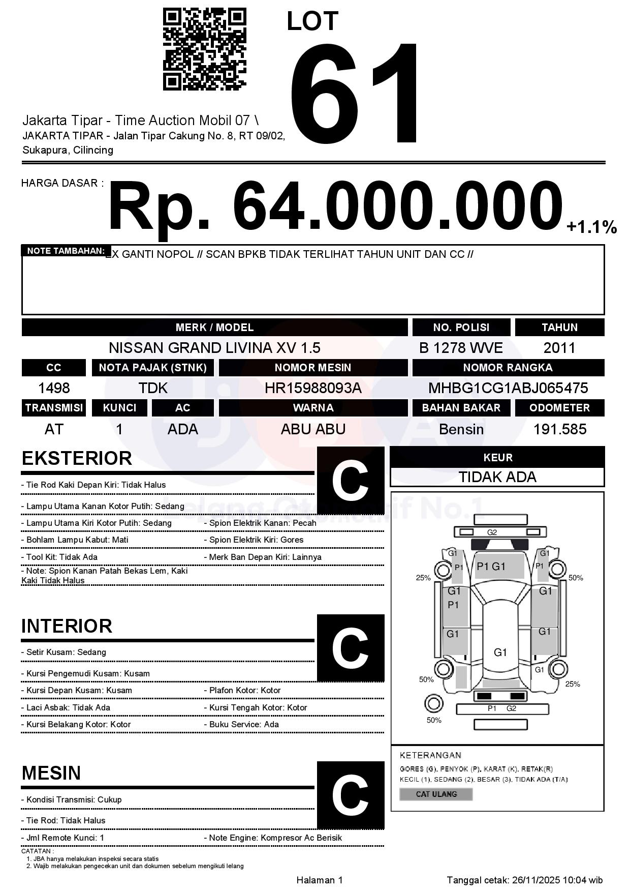 - Kondisi objek lelang dilelang apa adanya, baik kondisi fisik, mesin maupun legalitas kendaraan. Jika terdapat kekurangan/cacat baik yang terlihat maupun yang tidak terlihat, maka semua akan menjadi tanggung jawab/risiko Pemenang Lelang. Oleh karena itu, Pemenang Lelang melepaskan segala hak untuk menuntut dan/atau meminta ganti rugi atas hal tersebut kepada JBA.