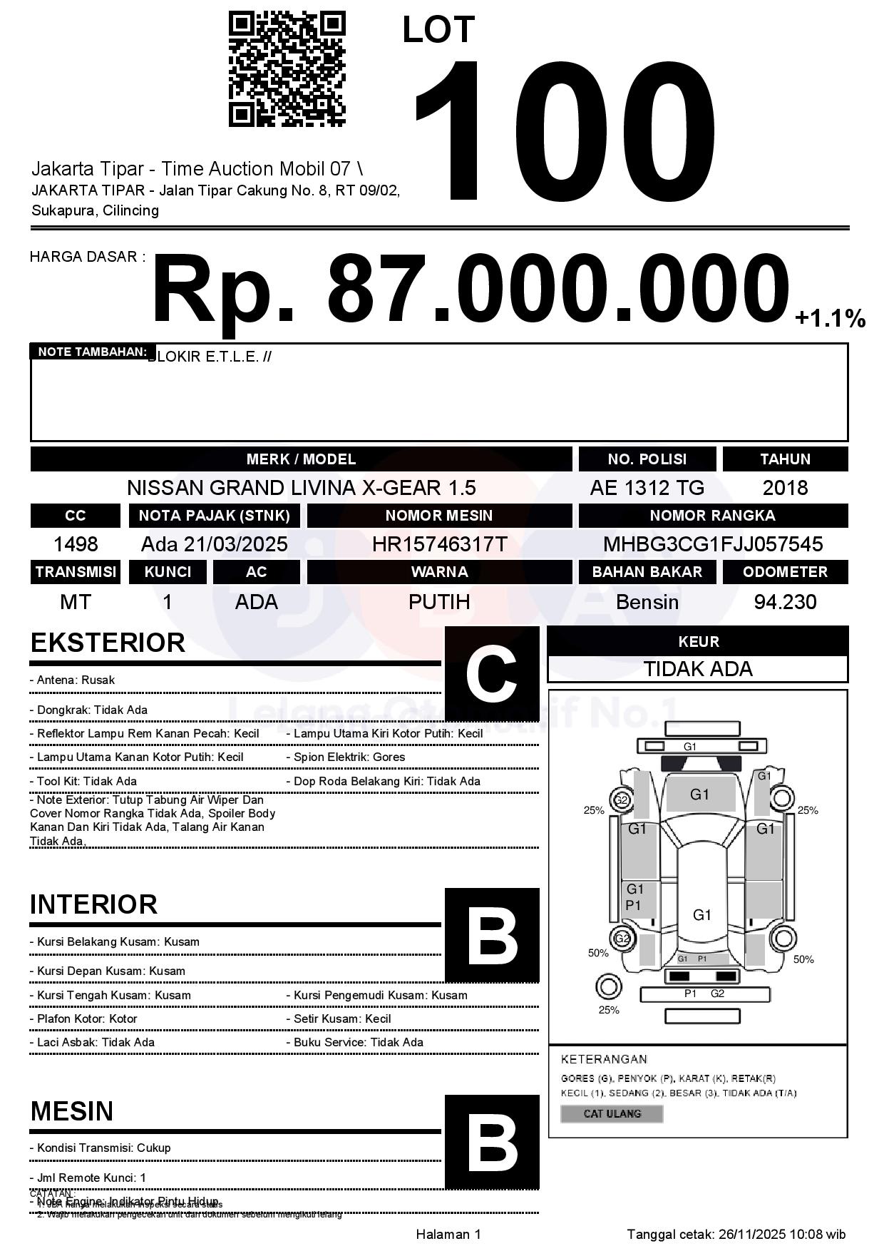- Kondisi objek lelang dilelang apa adanya, baik kondisi fisik, mesin maupun legalitas kendaraan. Jika terdapat kekurangan/cacat baik yang terlihat maupun yang tidak terlihat, maka semua akan menjadi tanggung jawab/risiko Pemenang Lelang. Oleh karena itu, Pemenang Lelang melepaskan segala hak untuk menuntut dan/atau meminta ganti rugi atas hal tersebut kepada JBA.