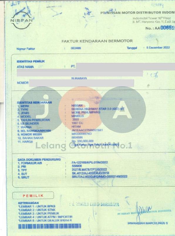 - Biaya pemindahan objek lelang dan pengurusan balik nama pada dokumen kepemilikan merupakan tanggung jawab dan beban dari Pemenang Lelang.