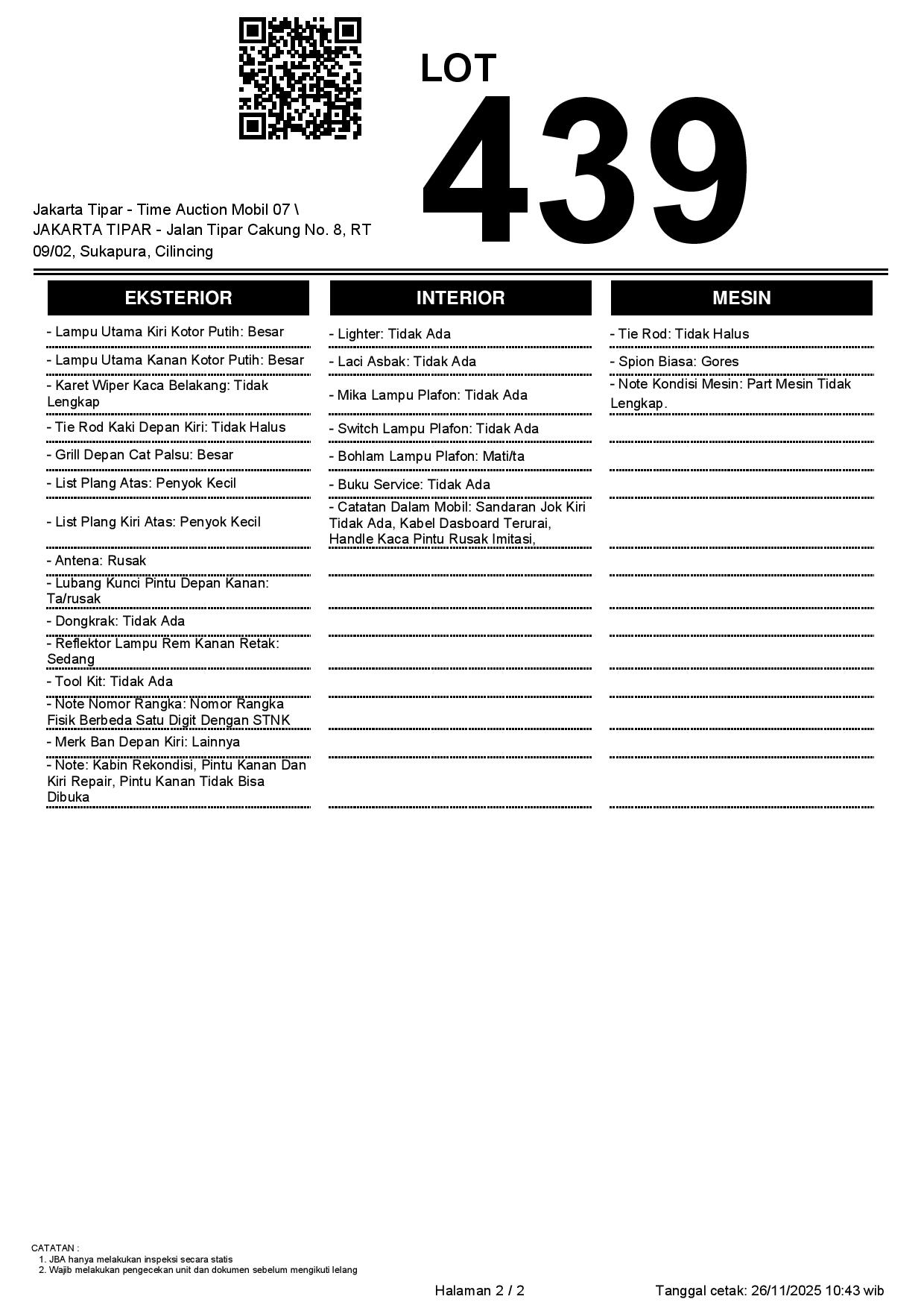 - Kondisi objek lelang dilelang apa adanya, baik kondisi fisik, mesin maupun legalitas kendaraan. Jika terdapat kekurangan/cacat baik yang terlihat maupun yang tidak terlihat, maka semua akan menjadi tanggung jawab/risiko Pemenang Lelang. Oleh karena itu, Pemenang Lelang melepaskan segala hak untuk menuntut dan/atau meminta ganti rugi atas hal tersebut kepada JBA.
