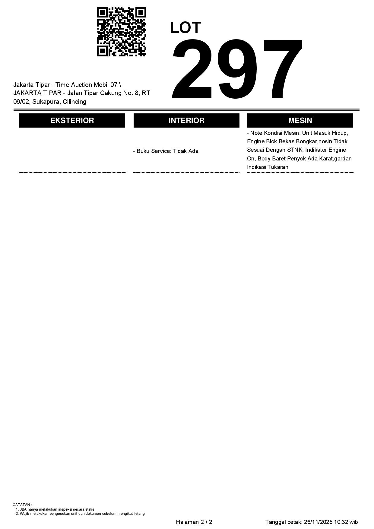 - Kondisi objek lelang dilelang apa adanya, baik kondisi fisik, mesin maupun legalitas kendaraan. Jika terdapat kekurangan/cacat baik yang terlihat maupun yang tidak terlihat, maka semua akan menjadi tanggung jawab/risiko Pemenang Lelang. Oleh karena itu, Pemenang Lelang melepaskan segala hak untuk menuntut dan/atau meminta ganti rugi atas hal tersebut kepada JBA.