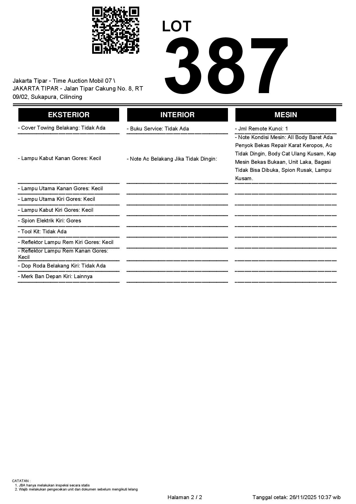 - Kondisi objek lelang dilelang apa adanya, baik kondisi fisik, mesin maupun legalitas kendaraan. Jika terdapat kekurangan/cacat baik yang terlihat maupun yang tidak terlihat, maka semua akan menjadi tanggung jawab/risiko Pemenang Lelang. Oleh karena itu, Pemenang Lelang melepaskan segala hak untuk menuntut dan/atau meminta ganti rugi atas hal tersebut kepada JBA.
