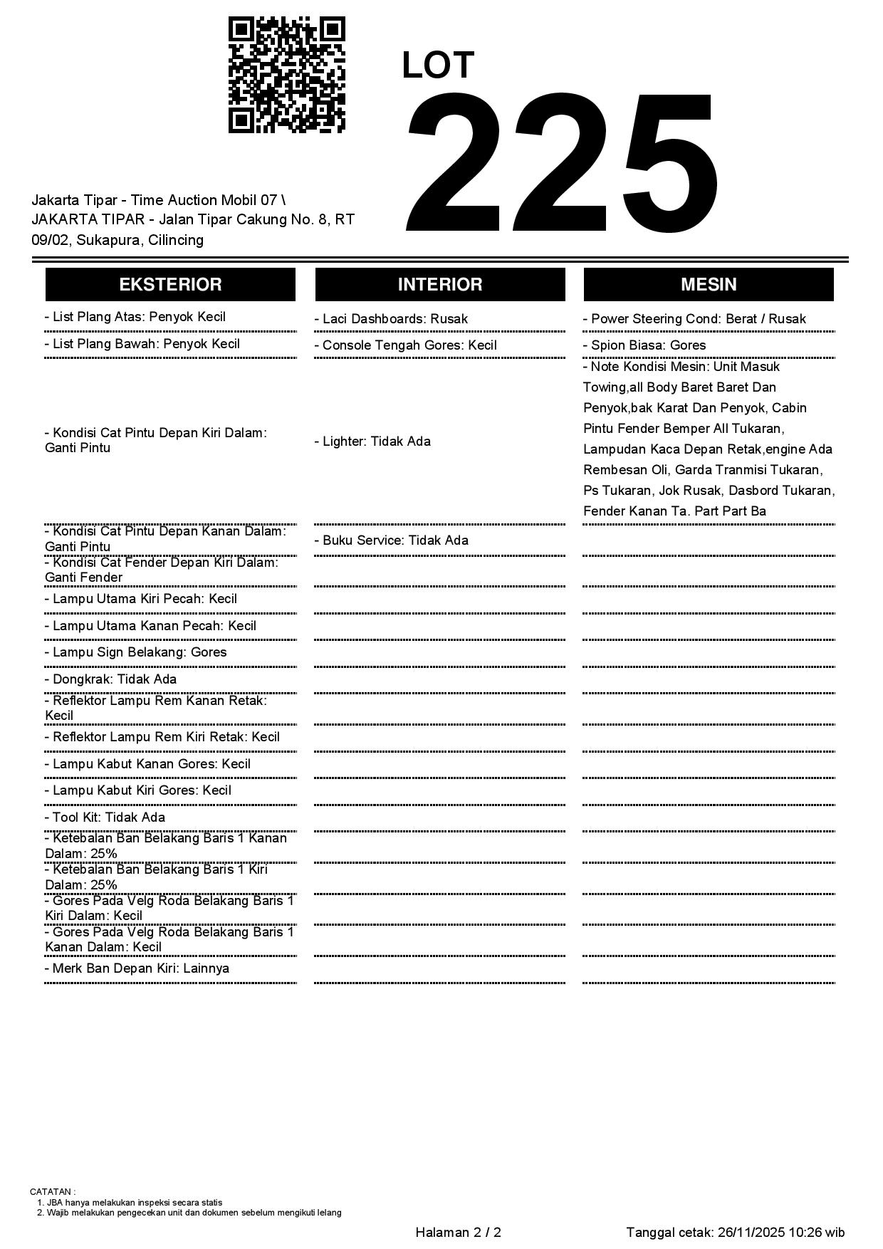 - Kondisi objek lelang dilelang apa adanya, baik kondisi fisik, mesin maupun legalitas kendaraan. Jika terdapat kekurangan/cacat baik yang terlihat maupun yang tidak terlihat, maka semua akan menjadi tanggung jawab/risiko Pemenang Lelang. Oleh karena itu, Pemenang Lelang melepaskan segala hak untuk menuntut dan/atau meminta ganti rugi atas hal tersebut kepada JBA.