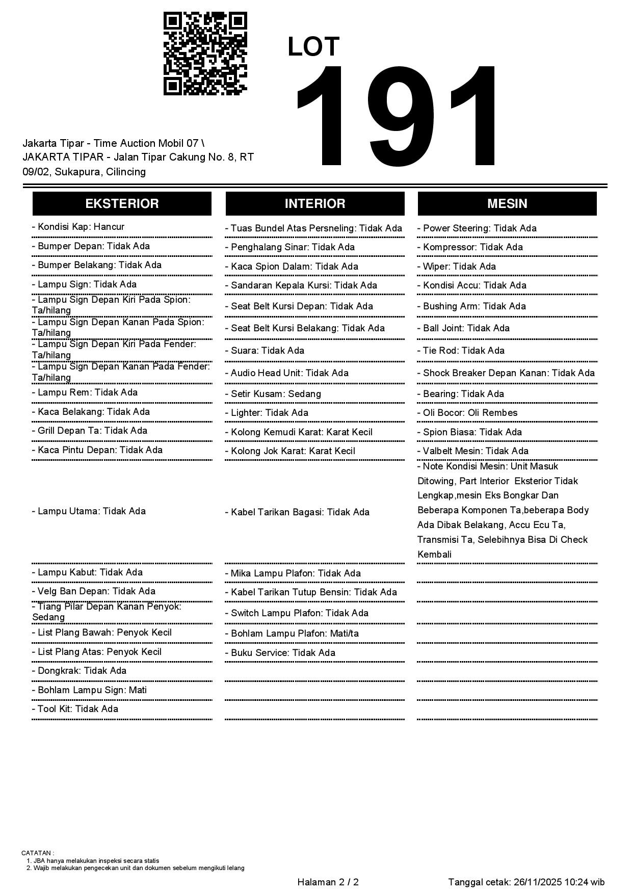 - Kondisi objek lelang dilelang apa adanya, baik kondisi fisik, mesin maupun legalitas kendaraan. Jika terdapat kekurangan/cacat baik yang terlihat maupun yang tidak terlihat, maka semua akan menjadi tanggung jawab/risiko Pemenang Lelang. Oleh karena itu, Pemenang Lelang melepaskan segala hak untuk menuntut dan/atau meminta ganti rugi atas hal tersebut kepada JBA.