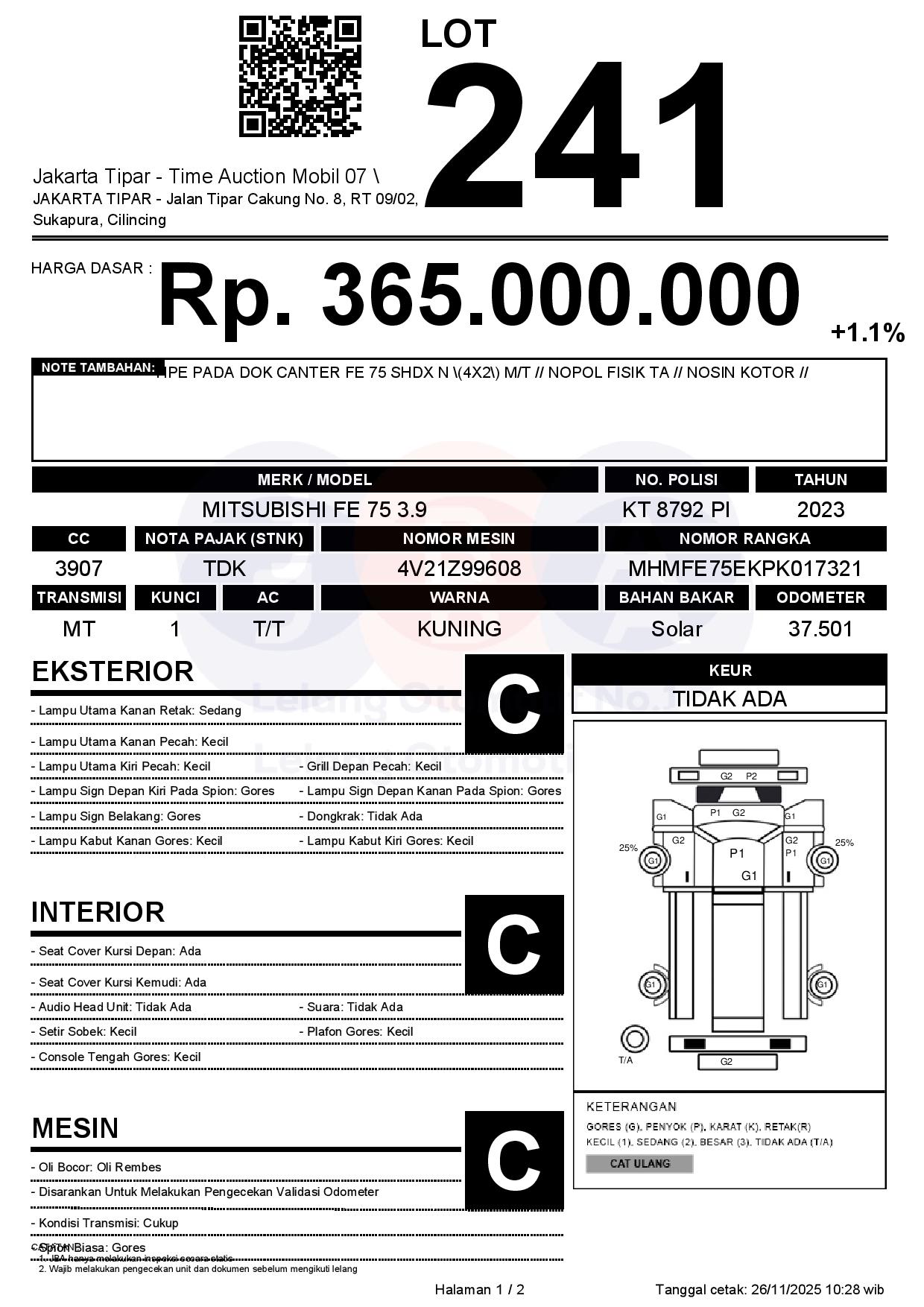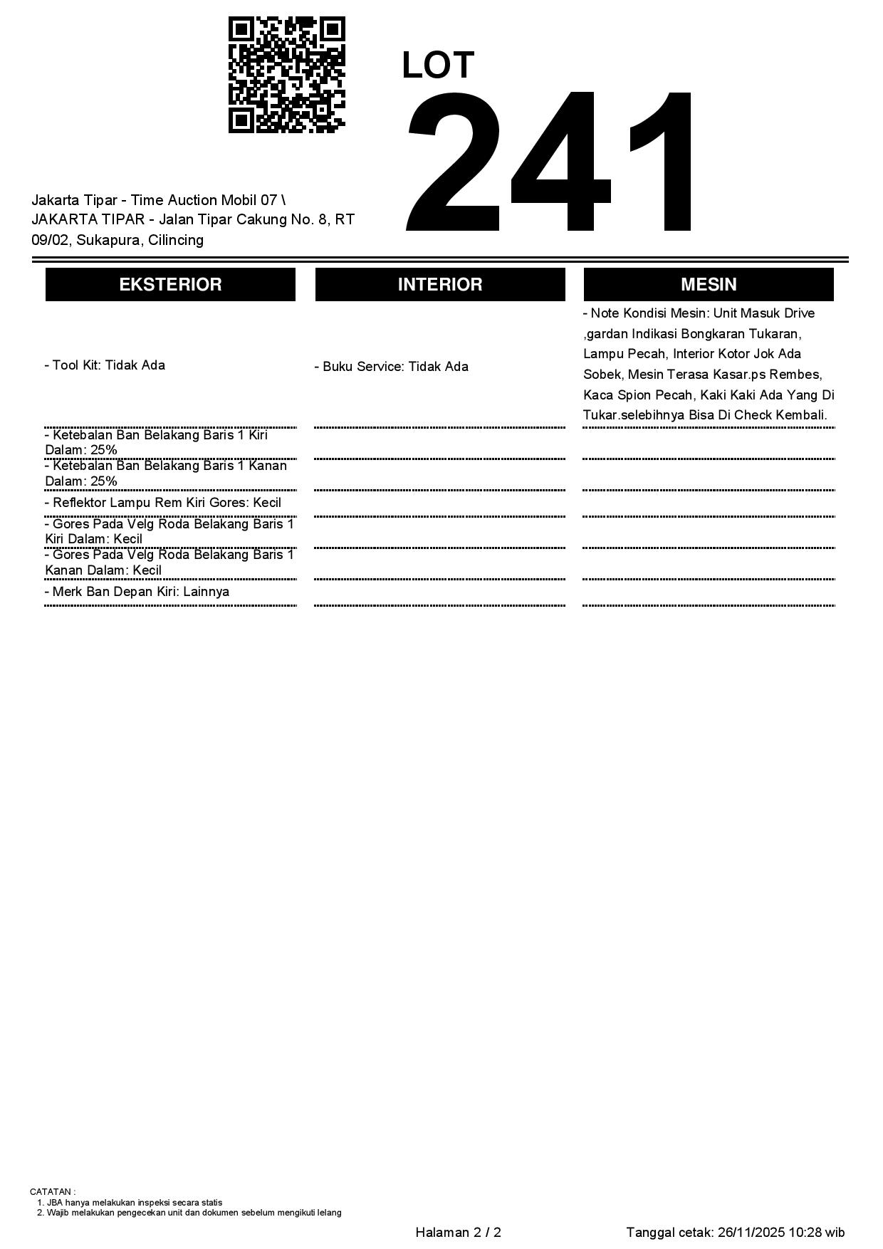 - Kondisi objek lelang dilelang apa adanya, baik kondisi fisik, mesin maupun legalitas kendaraan. Jika terdapat kekurangan/cacat baik yang terlihat maupun yang tidak terlihat, maka semua akan menjadi tanggung jawab/risiko Pemenang Lelang. Oleh karena itu, Pemenang Lelang melepaskan segala hak untuk menuntut dan/atau meminta ganti rugi atas hal tersebut kepada JBA.