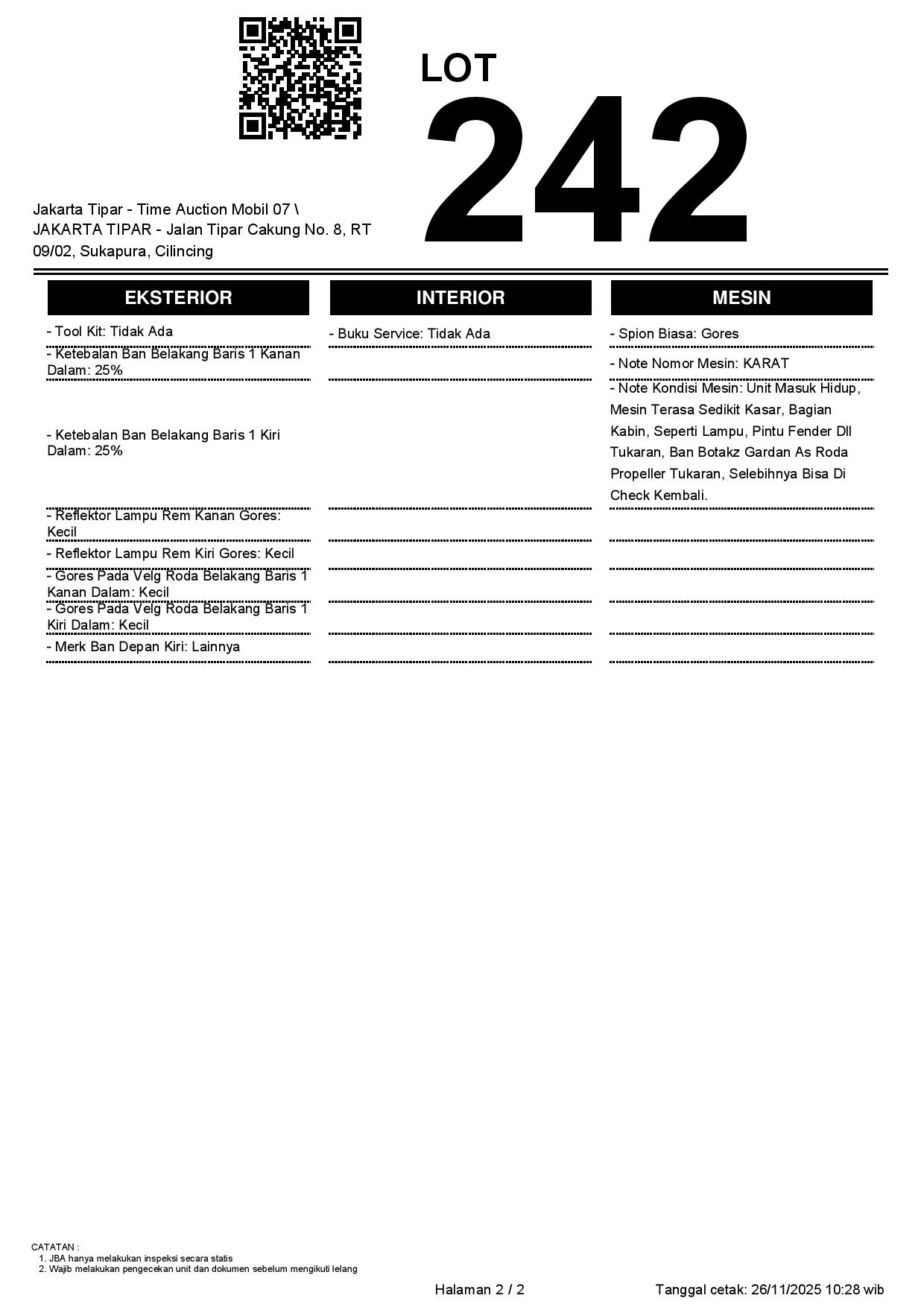 - Kondisi objek lelang dilelang apa adanya, baik kondisi fisik, mesin maupun legalitas kendaraan. Jika terdapat kekurangan/cacat baik yang terlihat maupun yang tidak terlihat, maka semua akan menjadi tanggung jawab/risiko Pemenang Lelang. Oleh karena itu, Pemenang Lelang melepaskan segala hak untuk menuntut dan/atau meminta ganti rugi atas hal tersebut kepada JBA.