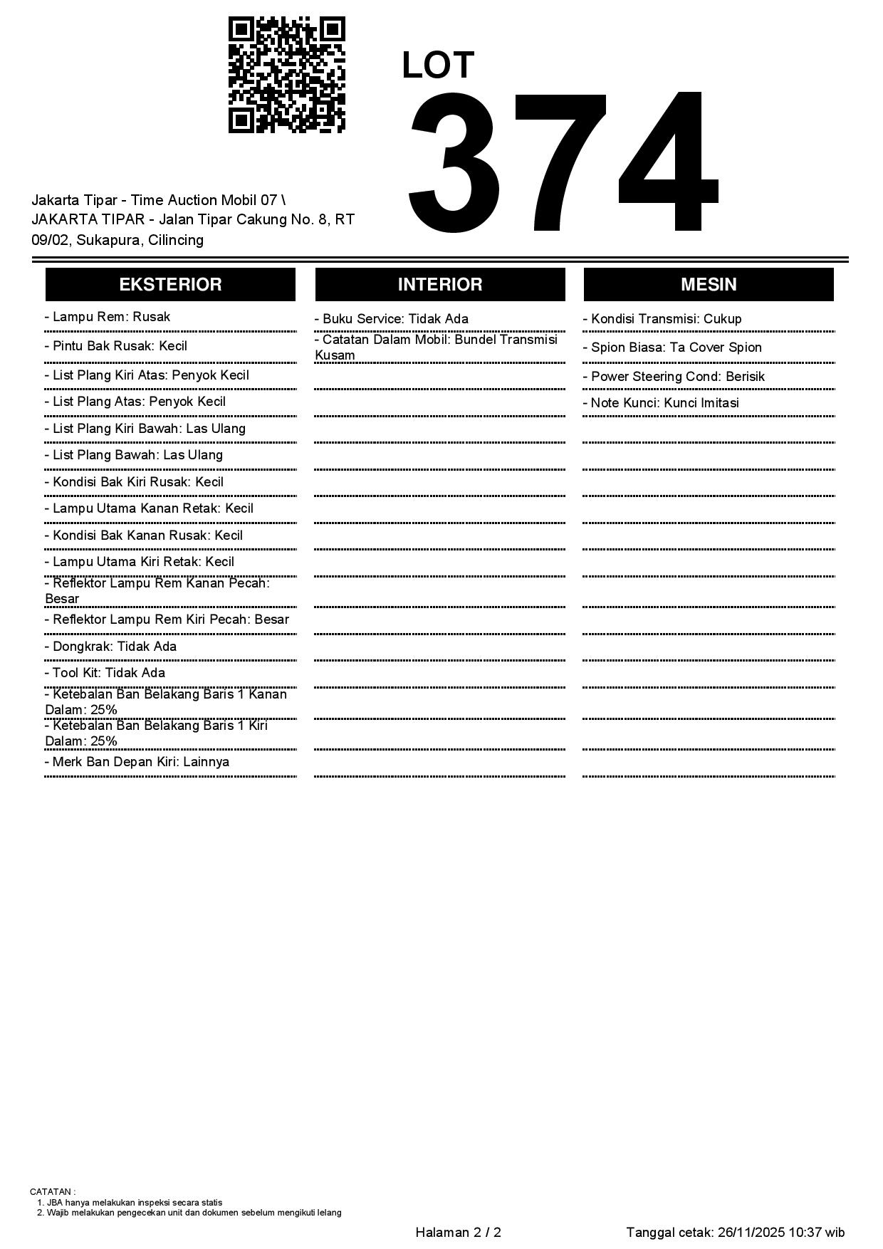 - Kondisi objek lelang dilelang apa adanya, baik kondisi fisik, mesin maupun legalitas kendaraan. Jika terdapat kekurangan/cacat baik yang terlihat maupun yang tidak terlihat, maka semua akan menjadi tanggung jawab/risiko Pemenang Lelang. Oleh karena itu, Pemenang Lelang melepaskan segala hak untuk menuntut dan/atau meminta ganti rugi atas hal tersebut kepada JBA.