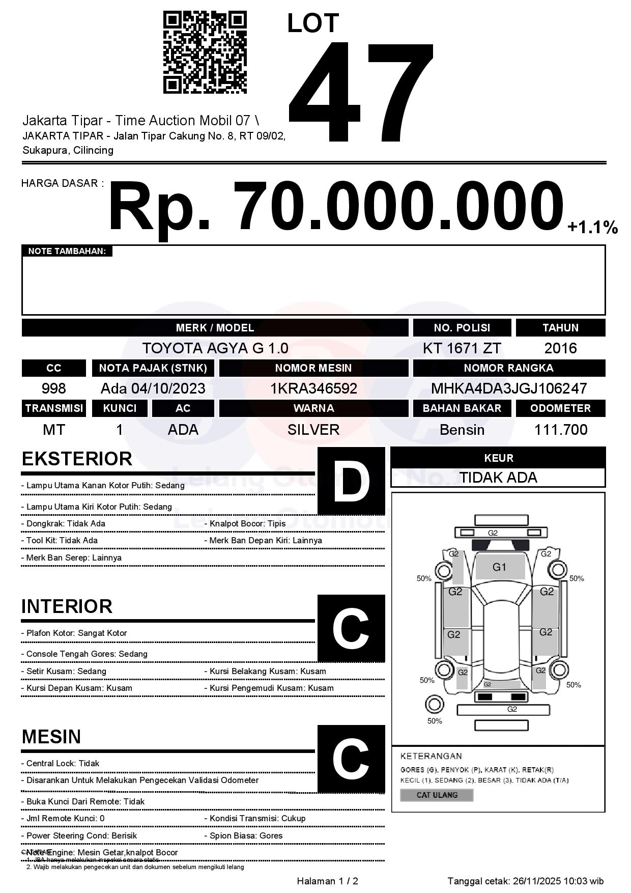 - Kondisi objek lelang dilelang apa adanya, baik kondisi fisik, mesin maupun legalitas kendaraan. Jika terdapat kekurangan/cacat baik yang terlihat maupun yang tidak terlihat, maka semua akan menjadi tanggung jawab/risiko Pemenang Lelang. Oleh karena itu, Pemenang Lelang melepaskan segala hak untuk menuntut dan/atau meminta ganti rugi atas hal tersebut kepada JBA.