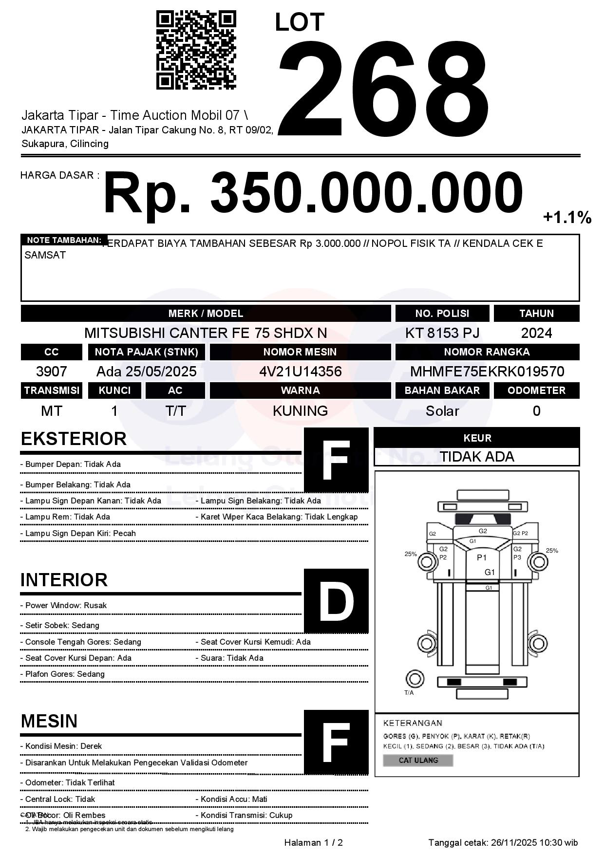 - Apabila harga terbentuk tidak mencapai Rp 500.000.000,- (lima ratus juta rupiah) maka Biaya Administrasi Lelang yang dibayarkan oleh Pemenang Lelang adalah sebesar Rp 3.000.000,- (tiga juta rupiah) per unit.