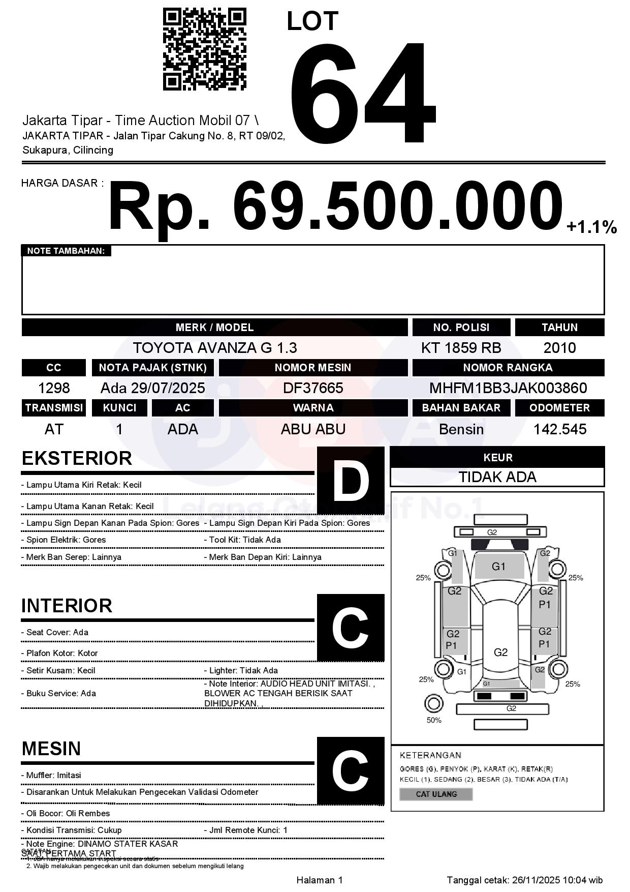 - Kondisi objek lelang dilelang apa adanya, baik kondisi fisik, mesin maupun legalitas kendaraan. Jika terdapat kekurangan/cacat baik yang terlihat maupun yang tidak terlihat, maka semua akan menjadi tanggung jawab/risiko Pemenang Lelang. Oleh karena itu, Pemenang Lelang melepaskan segala hak untuk menuntut dan/atau meminta ganti rugi atas hal tersebut kepada JBA.
