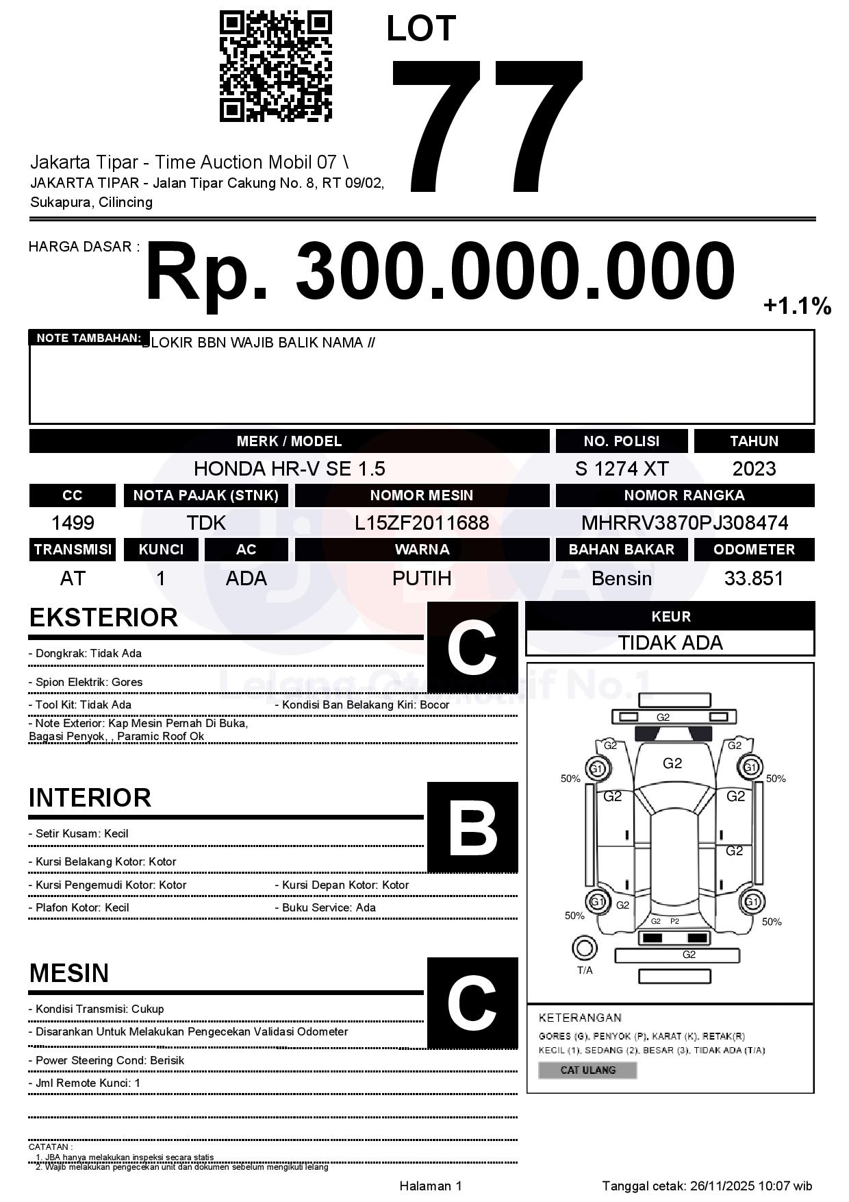 - Kondisi objek lelang dilelang apa adanya, baik kondisi fisik, mesin maupun legalitas kendaraan. Jika terdapat kekurangan/cacat baik yang terlihat maupun yang tidak terlihat, maka semua akan menjadi tanggung jawab/risiko Pemenang Lelang. Oleh karena itu, Pemenang Lelang melepaskan segala hak untuk menuntut dan/atau meminta ganti rugi atas hal tersebut kepada JBA.