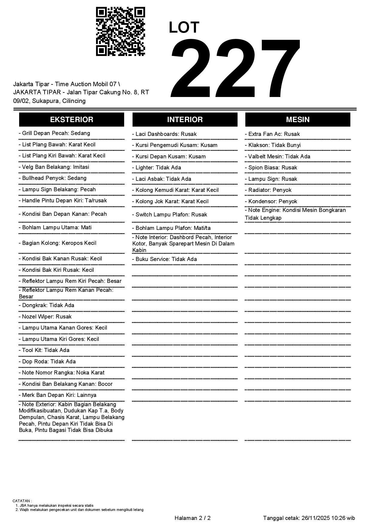 - Kondisi objek lelang dilelang apa adanya, baik kondisi fisik, mesin maupun legalitas kendaraan. Jika terdapat kekurangan/cacat baik yang terlihat maupun yang tidak terlihat, maka semua akan menjadi tanggung jawab/risiko Pemenang Lelang. Oleh karena itu, Pemenang Lelang melepaskan segala hak untuk menuntut dan/atau meminta ganti rugi atas hal tersebut kepada JBA.