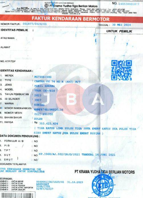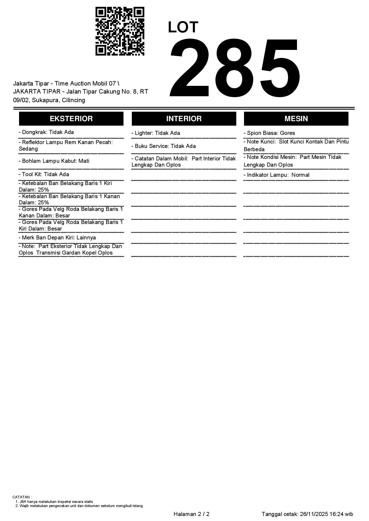 - Kondisi objek lelang dilelang apa adanya, baik kondisi fisik, mesin maupun legalitas kendaraan. Jika terdapat kekurangan/cacat baik yang terlihat maupun yang tidak terlihat, maka semua akan menjadi tanggung jawab/risiko Pemenang Lelang. Oleh karena itu, Pemenang Lelang melepaskan segala hak untuk menuntut dan/atau meminta ganti rugi atas hal tersebut kepada JBA.