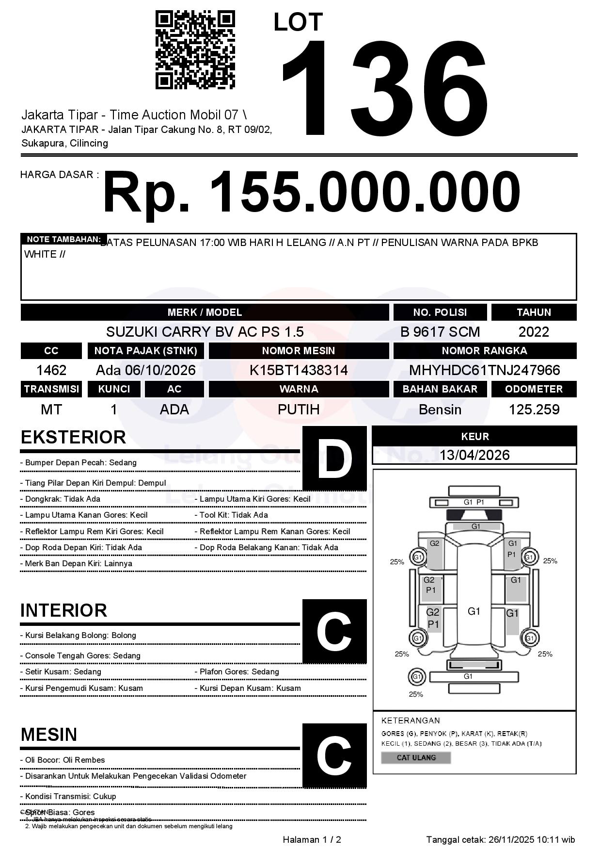- Kondisi objek lelang dilelang apa adanya, baik kondisi fisik, mesin maupun legalitas kendaraan. Jika terdapat kekurangan/cacat baik yang terlihat maupun yang tidak terlihat, maka semua akan menjadi tanggung jawab/risiko Pemenang Lelang. Oleh karena itu, Pemenang Lelang melepaskan segala hak untuk menuntut dan/atau meminta ganti rugi atas hal tersebut kepada JBA.