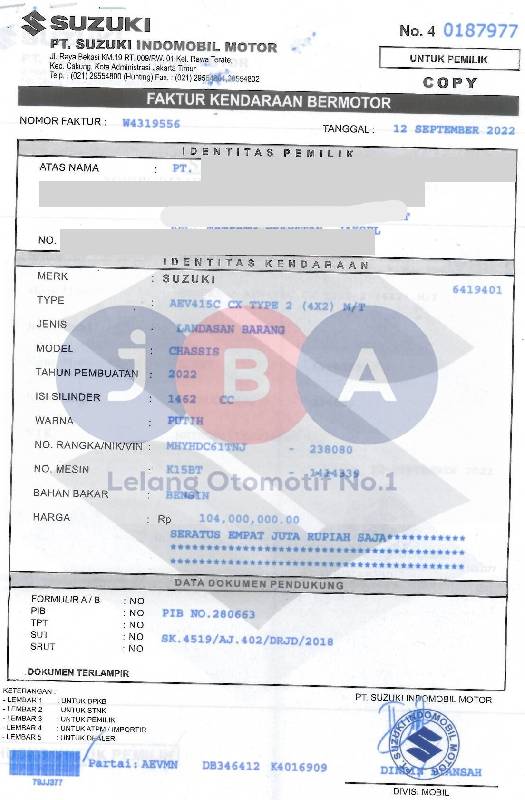 - Kondisi objek lelang dilelang apa adanya, baik kondisi fisik, mesin maupun legalitas kendaraan. Jika terdapat kekurangan/cacat baik yang terlihat maupun yang tidak terlihat, maka semua akan menjadi tanggung jawab/risiko Pemenang Lelang. Oleh karena itu, Pemenang Lelang melepaskan segala hak untuk menuntut dan/atau meminta ganti rugi atas hal tersebut kepada JBA.