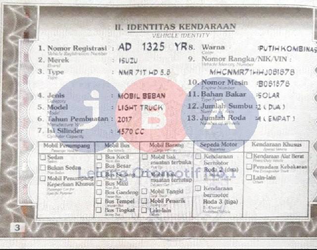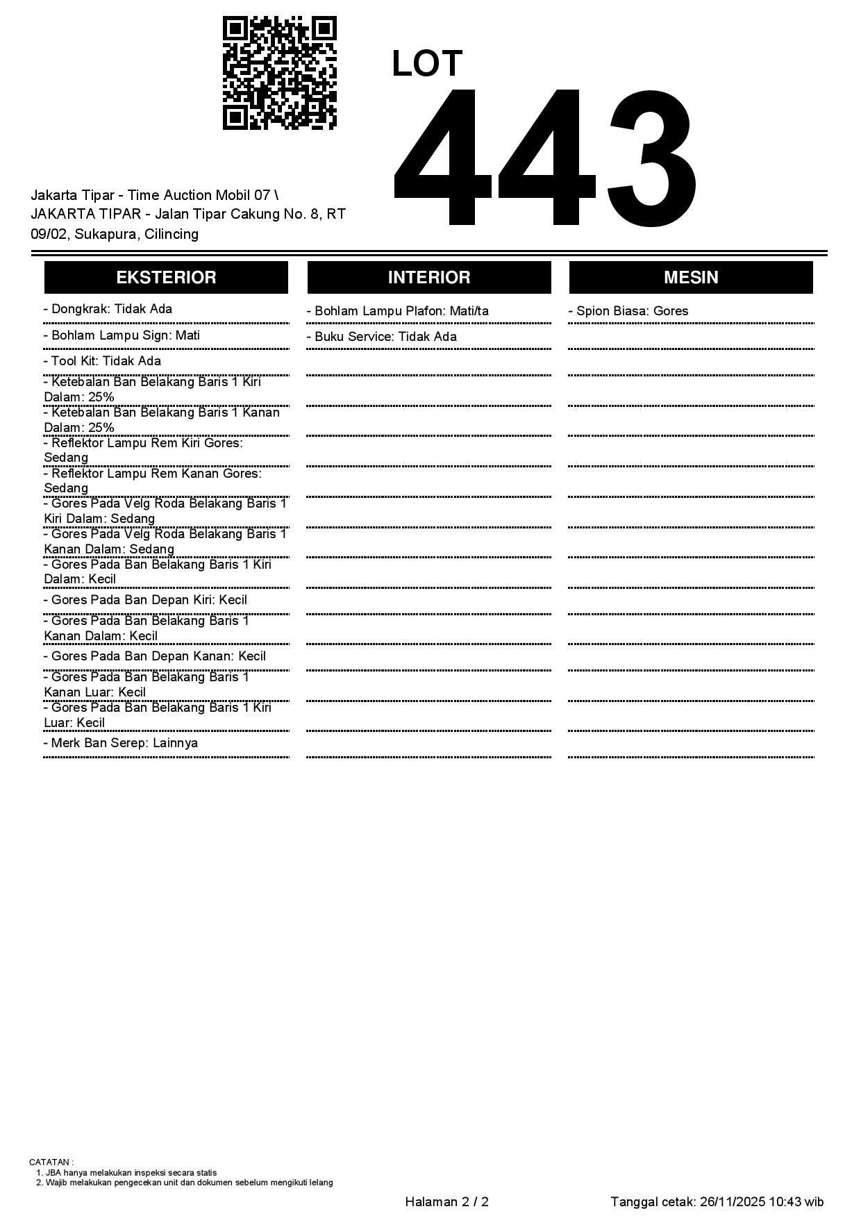 - Kondisi objek lelang dilelang apa adanya, baik kondisi fisik, mesin maupun legalitas kendaraan. Jika terdapat kekurangan/cacat baik yang terlihat maupun yang tidak terlihat, maka semua akan menjadi tanggung jawab/risiko Pemenang Lelang. Oleh karena itu, Pemenang Lelang melepaskan segala hak untuk menuntut dan/atau meminta ganti rugi atas hal tersebut kepada JBA.