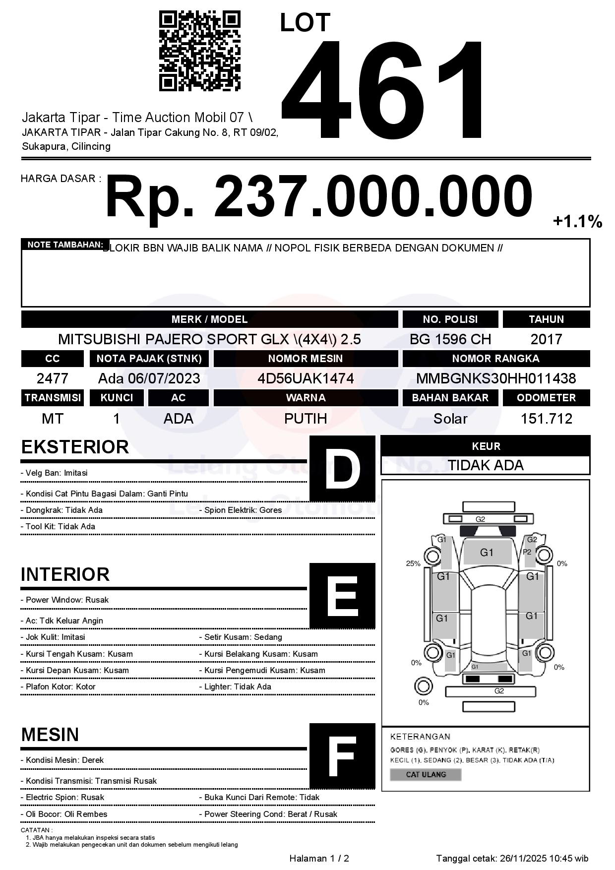 - Kondisi objek lelang dilelang apa adanya, baik kondisi fisik, mesin maupun legalitas kendaraan. Jika terdapat kekurangan/cacat baik yang terlihat maupun yang tidak terlihat, maka semua akan menjadi tanggung jawab/risiko Pemenang Lelang. Oleh karena itu, Pemenang Lelang melepaskan segala hak untuk menuntut dan/atau meminta ganti rugi atas hal tersebut kepada JBA.