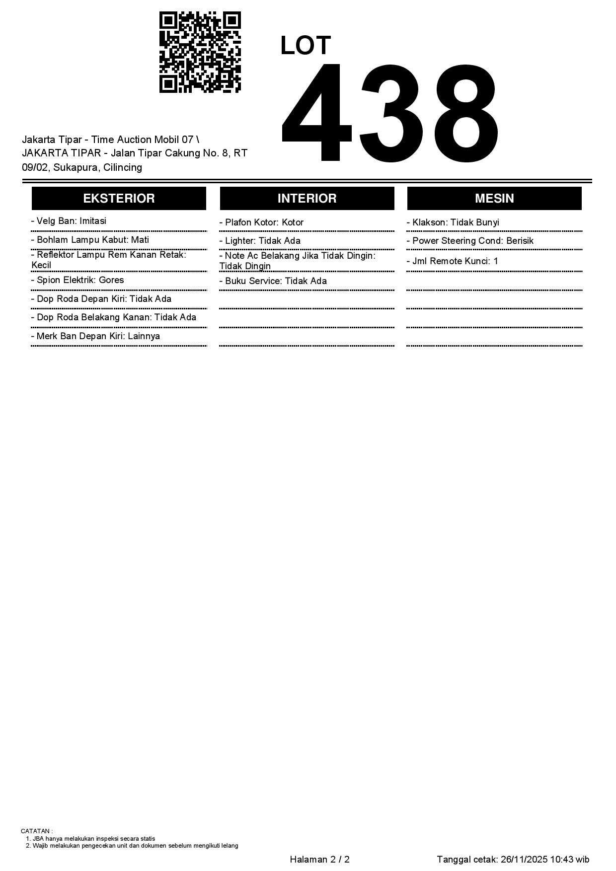 - Kondisi objek lelang dilelang apa adanya, baik kondisi fisik, mesin maupun legalitas kendaraan. Jika terdapat kekurangan/cacat baik yang terlihat maupun yang tidak terlihat, maka semua akan menjadi tanggung jawab/risiko Pemenang Lelang. Oleh karena itu, Pemenang Lelang melepaskan segala hak untuk menuntut dan/atau meminta ganti rugi atas hal tersebut kepada JBA.