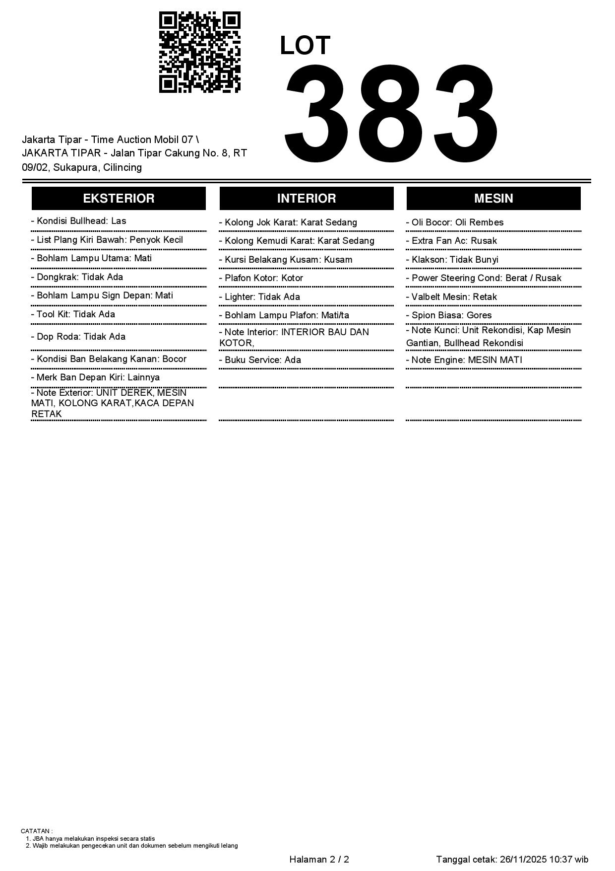 - Kondisi objek lelang dilelang apa adanya, baik kondisi fisik, mesin maupun legalitas kendaraan. Jika terdapat kekurangan/cacat baik yang terlihat maupun yang tidak terlihat, maka semua akan menjadi tanggung jawab/risiko Pemenang Lelang. Oleh karena itu, Pemenang Lelang melepaskan segala hak untuk menuntut dan/atau meminta ganti rugi atas hal tersebut kepada JBA.
