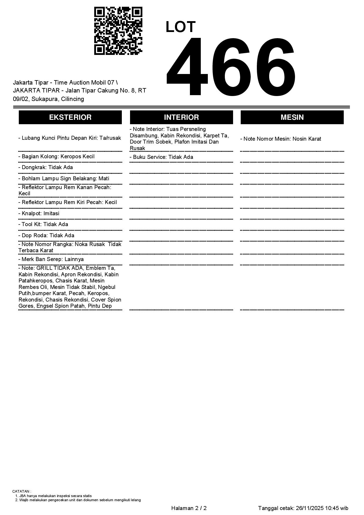 - Kondisi objek lelang dilelang apa adanya, baik kondisi fisik, mesin maupun legalitas kendaraan. Jika terdapat kekurangan/cacat baik yang terlihat maupun yang tidak terlihat, maka semua akan menjadi tanggung jawab/risiko Pemenang Lelang. Oleh karena itu, Pemenang Lelang melepaskan segala hak untuk menuntut dan/atau meminta ganti rugi atas hal tersebut kepada JBA.
