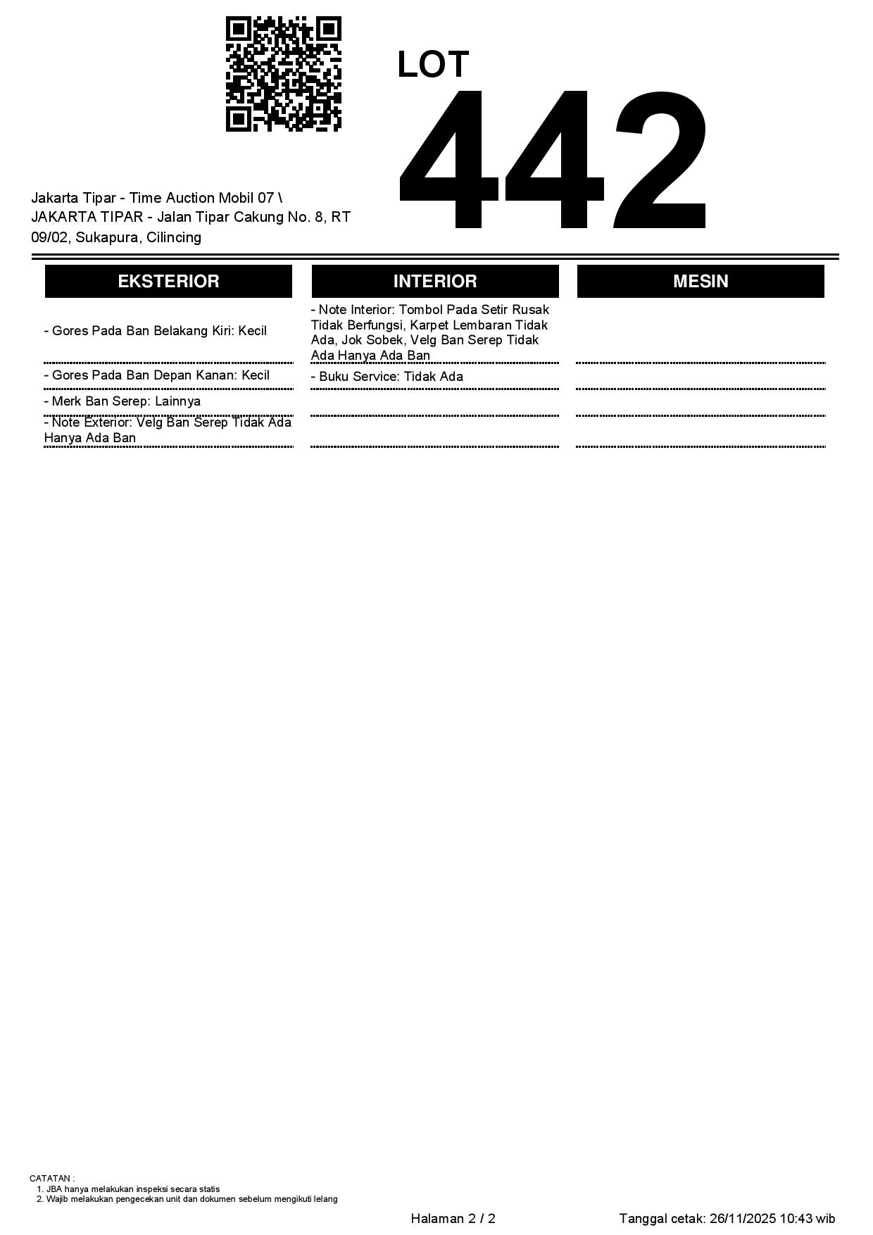 - Kondisi objek lelang dilelang apa adanya, baik kondisi fisik, mesin maupun legalitas kendaraan. Jika terdapat kekurangan/cacat baik yang terlihat maupun yang tidak terlihat, maka semua akan menjadi tanggung jawab/risiko Pemenang Lelang. Oleh karena itu, Pemenang Lelang melepaskan segala hak untuk menuntut dan/atau meminta ganti rugi atas hal tersebut kepada JBA.