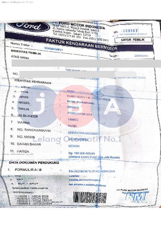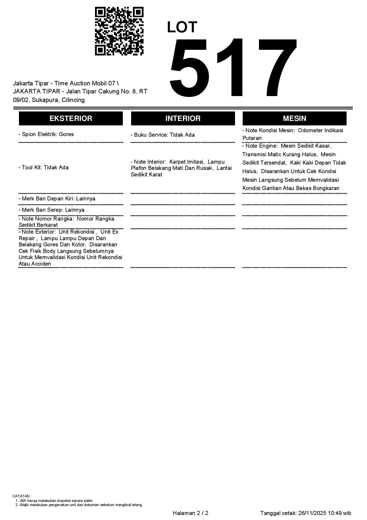 - Kondisi objek lelang dilelang apa adanya, baik kondisi fisik, mesin maupun legalitas kendaraan. Jika terdapat kekurangan/cacat baik yang terlihat maupun yang tidak terlihat, maka semua akan menjadi tanggung jawab/risiko Pemenang Lelang. Oleh karena itu, Pemenang Lelang melepaskan segala hak untuk menuntut dan/atau meminta ganti rugi atas hal tersebut kepada JBA.