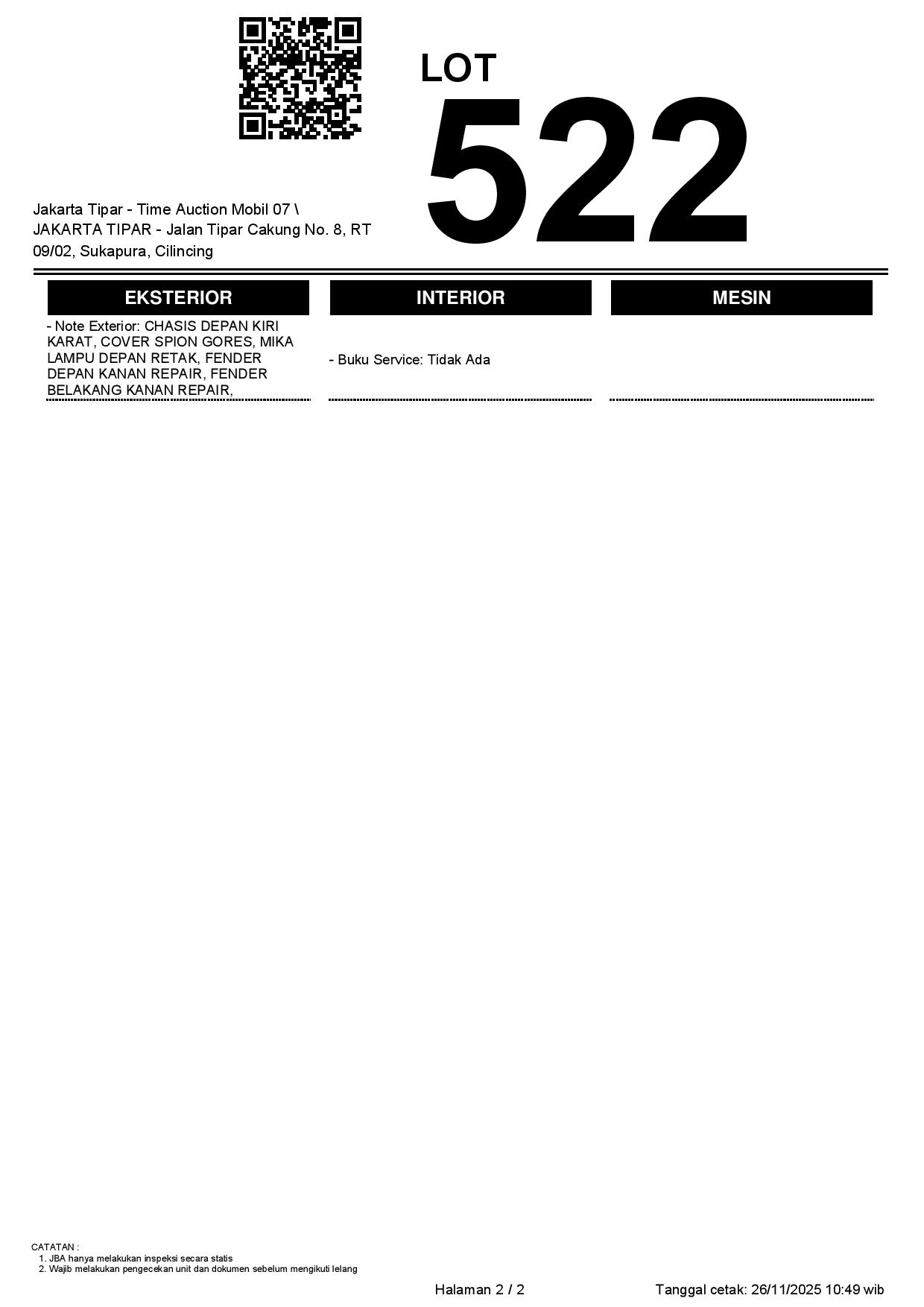 - Kondisi objek lelang dilelang apa adanya, baik kondisi fisik, mesin maupun legalitas kendaraan. Jika terdapat kekurangan/cacat baik yang terlihat maupun yang tidak terlihat, maka semua akan menjadi tanggung jawab/risiko Pemenang Lelang. Oleh karena itu, Pemenang Lelang melepaskan segala hak untuk menuntut dan/atau meminta ganti rugi atas hal tersebut kepada JBA.