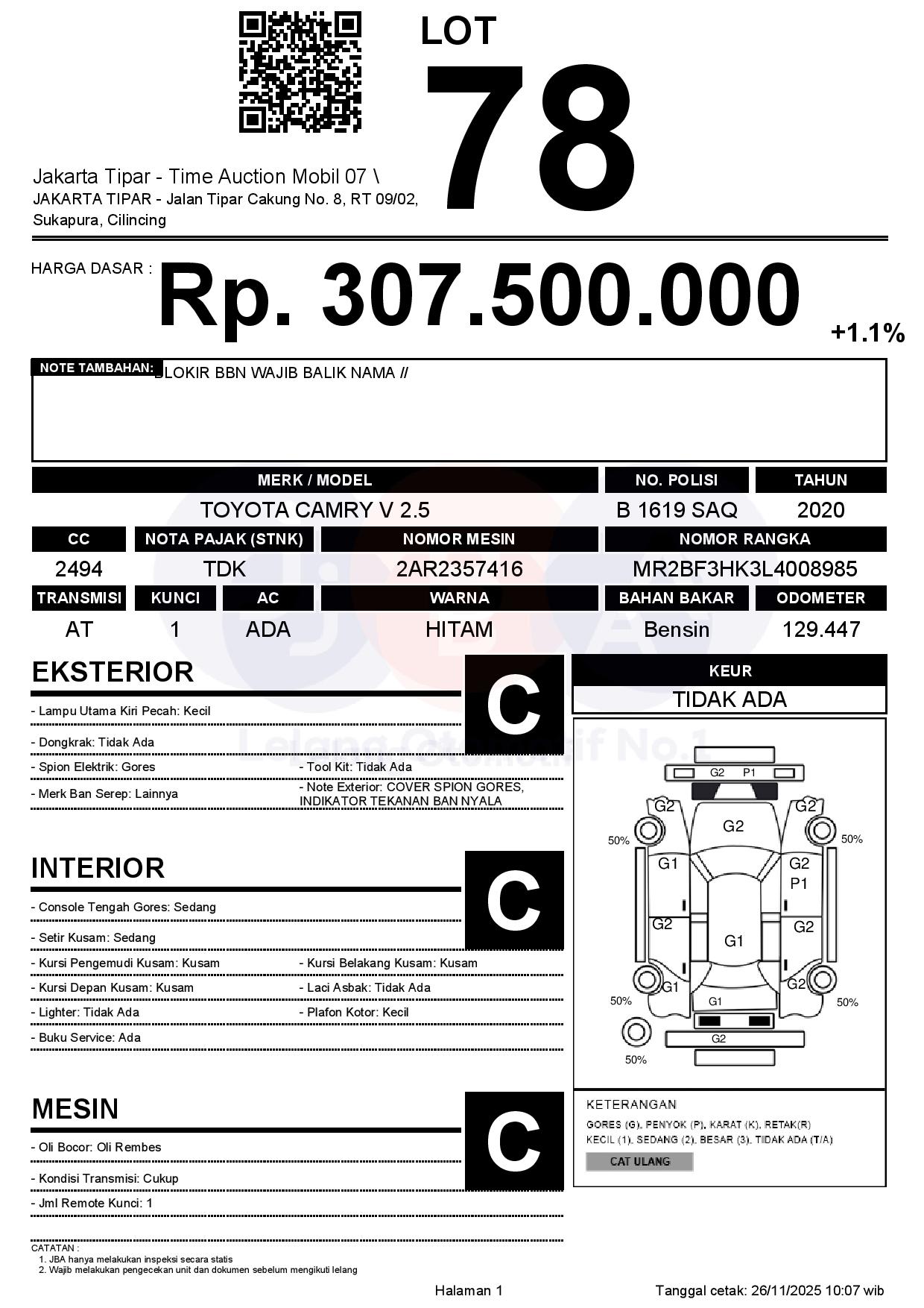 - Kondisi objek lelang dilelang apa adanya, baik kondisi fisik, mesin maupun legalitas kendaraan. Jika terdapat kekurangan/cacat baik yang terlihat maupun yang tidak terlihat, maka semua akan menjadi tanggung jawab/risiko Pemenang Lelang. Oleh karena itu, Pemenang Lelang melepaskan segala hak untuk menuntut dan/atau meminta ganti rugi atas hal tersebut kepada JBA.