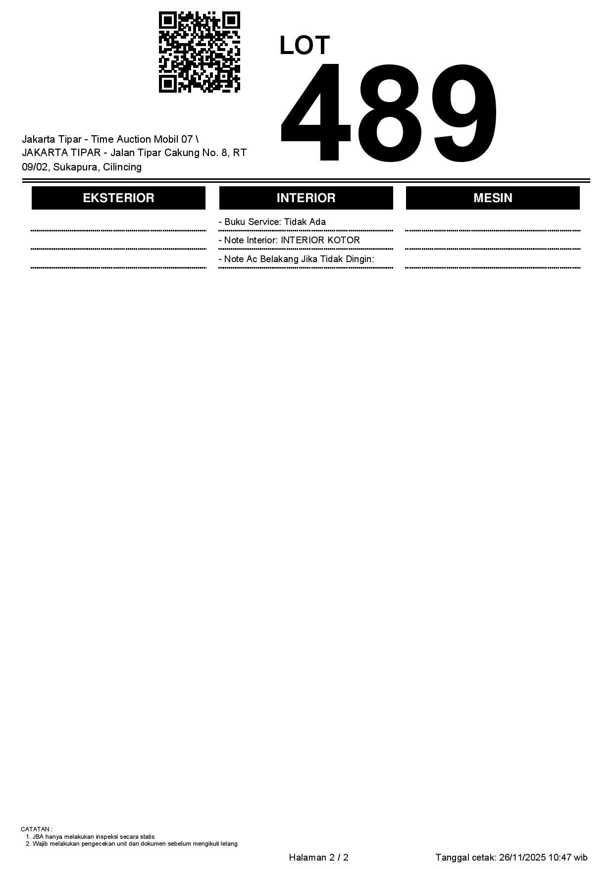 - Kondisi objek lelang dilelang apa adanya, baik kondisi fisik, mesin maupun legalitas kendaraan. Jika terdapat kekurangan/cacat baik yang terlihat maupun yang tidak terlihat, maka semua akan menjadi tanggung jawab/risiko Pemenang Lelang. Oleh karena itu, Pemenang Lelang melepaskan segala hak untuk menuntut dan/atau meminta ganti rugi atas hal tersebut kepada JBA.