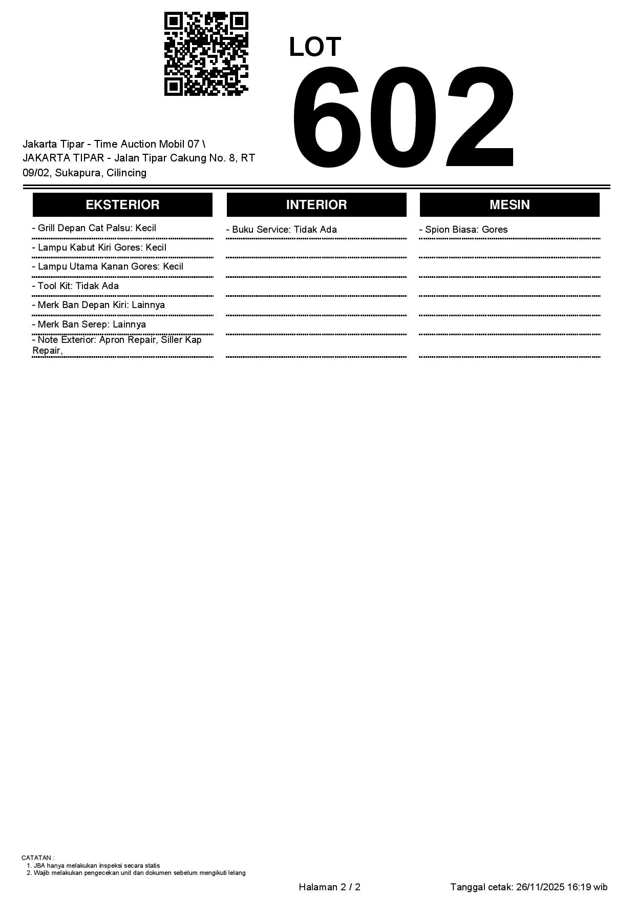 - Kondisi objek lelang dilelang apa adanya, baik kondisi fisik, mesin maupun legalitas kendaraan. Jika terdapat kekurangan/cacat baik yang terlihat maupun yang tidak terlihat, maka semua akan menjadi tanggung jawab/risiko Pemenang Lelang. Oleh karena itu, Pemenang Lelang melepaskan segala hak untuk menuntut dan/atau meminta ganti rugi atas hal tersebut kepada JBA.