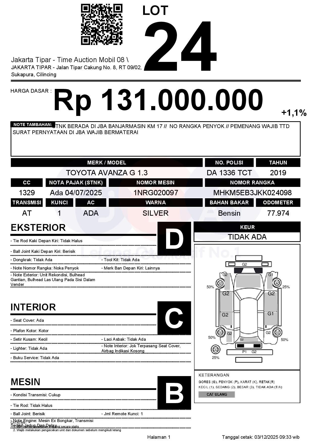 - Kondisi objek lelang dilelang apa adanya, baik kondisi fisik, mesin maupun legalitas kendaraan. Jika terdapat kekurangan/cacat baik yang terlihat maupun yang tidak terlihat, maka semua akan menjadi tanggung jawab/risiko Pemenang Lelang. Oleh karena itu, Pemenang Lelang melepaskan segala hak untuk menuntut dan/atau meminta ganti rugi atas hal tersebut kepada JBA.