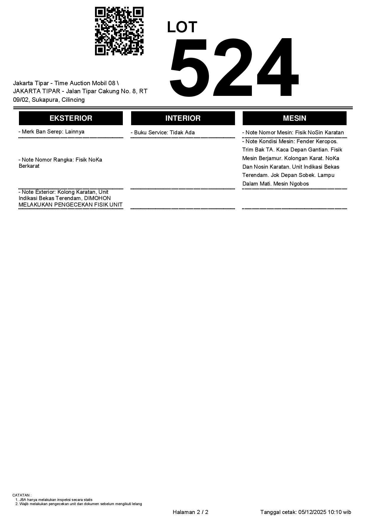 - Kondisi objek lelang dilelang apa adanya, baik kondisi fisik, mesin maupun legalitas kendaraan. Jika terdapat kekurangan/cacat baik yang terlihat maupun yang tidak terlihat, maka semua akan menjadi tanggung jawab/risiko Pemenang Lelang. Oleh karena itu, Pemenang Lelang melepaskan segala hak untuk menuntut dan/atau meminta ganti rugi atas hal tersebut kepada JBA.