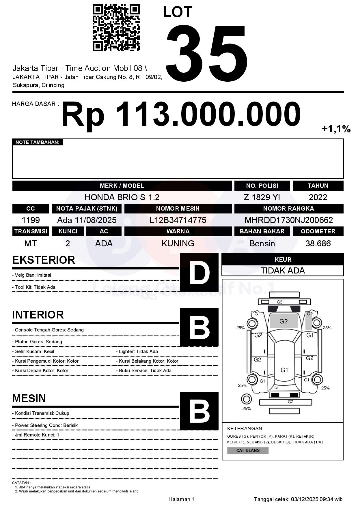 - Kondisi objek lelang dilelang apa adanya, baik kondisi fisik, mesin maupun legalitas kendaraan. Jika terdapat kekurangan/cacat baik yang terlihat maupun yang tidak terlihat, maka semua akan menjadi tanggung jawab/risiko Pemenang Lelang. Oleh karena itu, Pemenang Lelang melepaskan segala hak untuk menuntut dan/atau meminta ganti rugi atas hal tersebut kepada JBA.