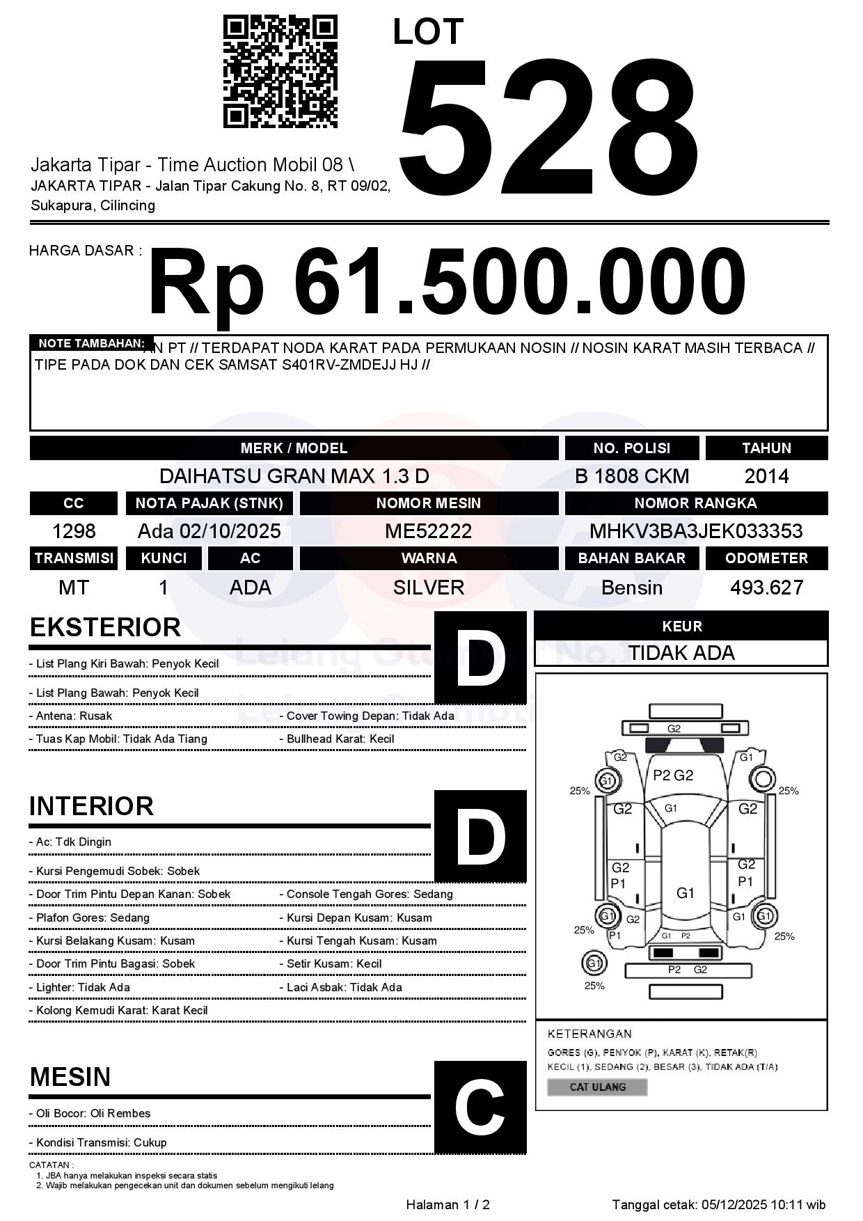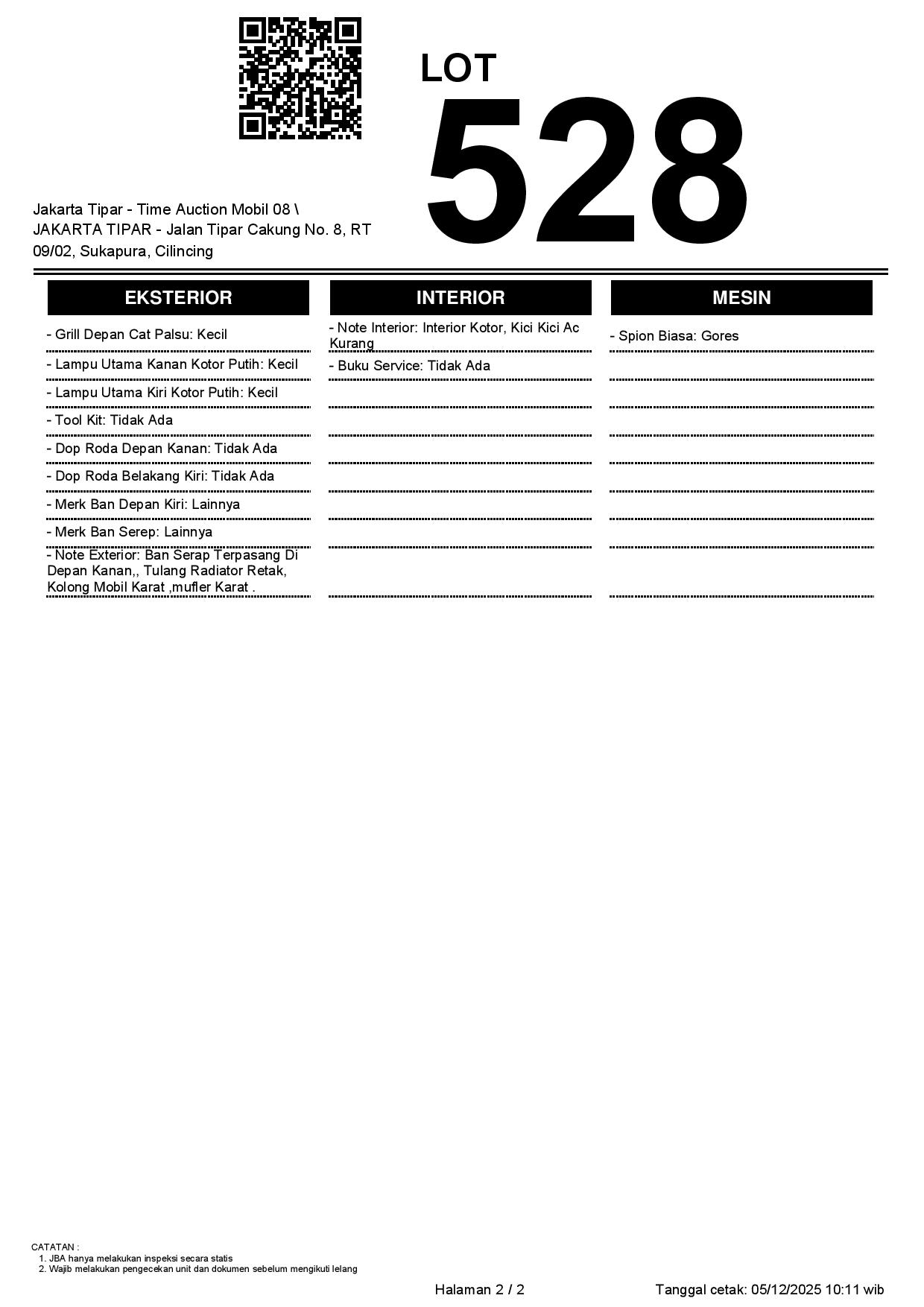 - Kondisi objek lelang dilelang apa adanya, baik kondisi fisik, mesin maupun legalitas kendaraan. Jika terdapat kekurangan/cacat baik yang terlihat maupun yang tidak terlihat, maka semua akan menjadi tanggung jawab/risiko Pemenang Lelang. Oleh karena itu, Pemenang Lelang melepaskan segala hak untuk menuntut dan/atau meminta ganti rugi atas hal tersebut kepada JBA.