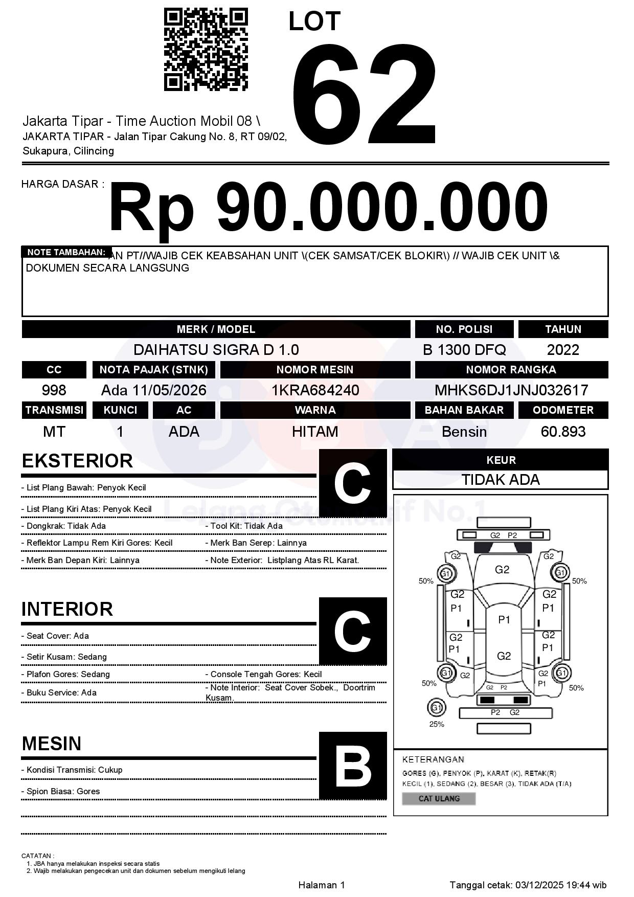 - Kondisi objek lelang dilelang apa adanya, baik kondisi fisik, mesin maupun legalitas kendaraan. Jika terdapat kekurangan/cacat baik yang terlihat maupun yang tidak terlihat, maka semua akan menjadi tanggung jawab/risiko Pemenang Lelang. Oleh karena itu, Pemenang Lelang melepaskan segala hak untuk menuntut dan/atau meminta ganti rugi atas hal tersebut kepada JBA.