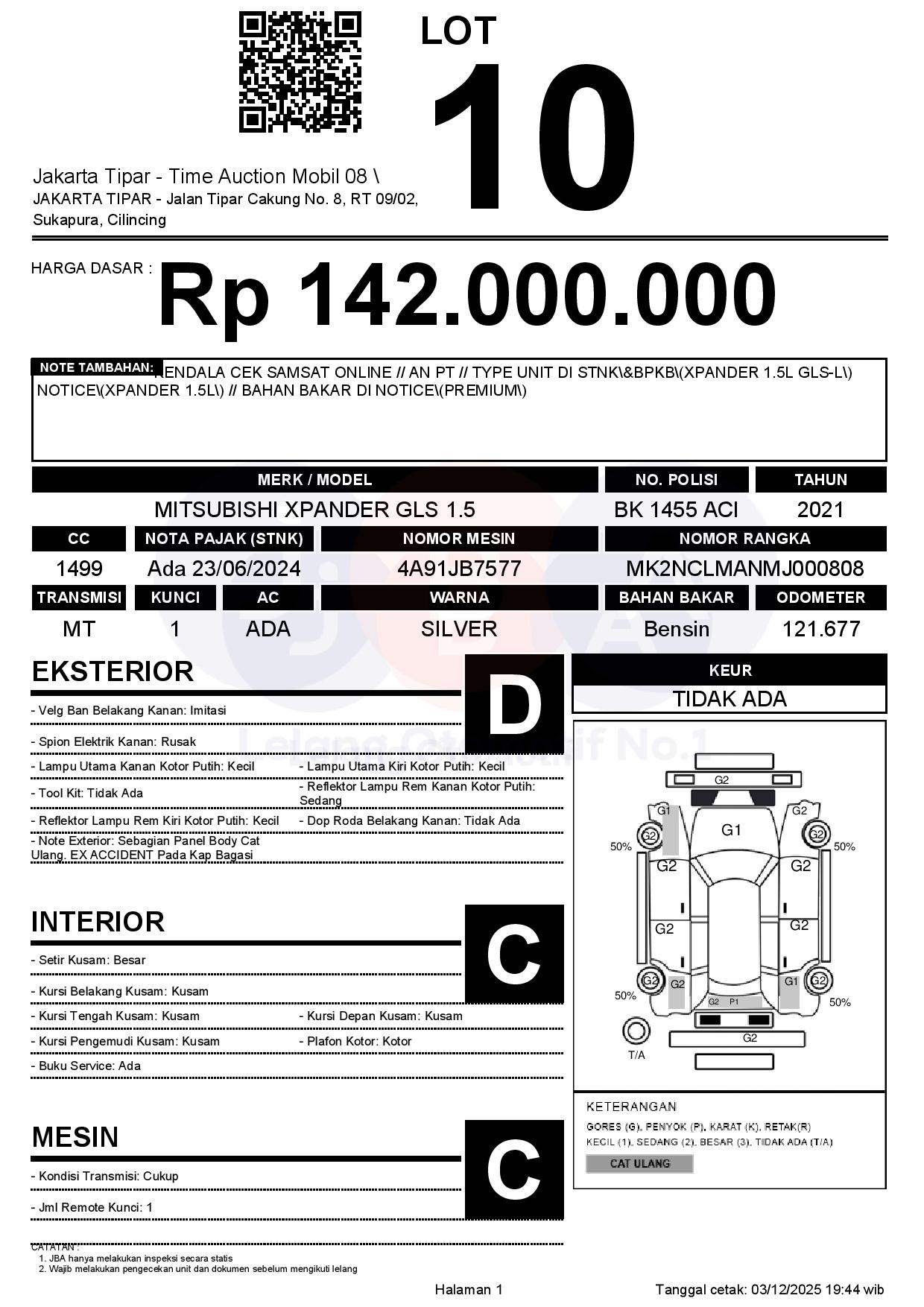 - Kondisi objek lelang dilelang apa adanya, baik kondisi fisik, mesin maupun legalitas kendaraan. Jika terdapat kekurangan/cacat baik yang terlihat maupun yang tidak terlihat, maka semua akan menjadi tanggung jawab/risiko Pemenang Lelang. Oleh karena itu, Pemenang Lelang melepaskan segala hak untuk menuntut dan/atau meminta ganti rugi atas hal tersebut kepada JBA.