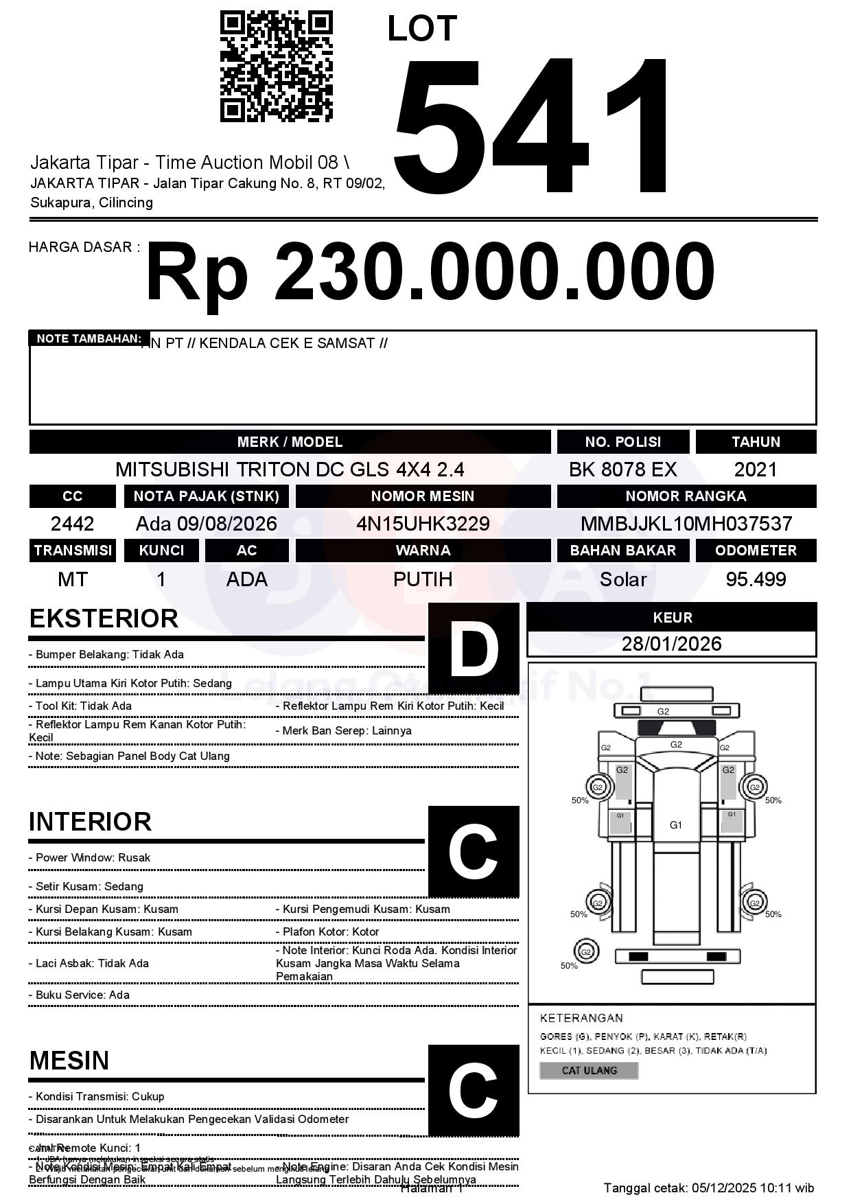 - Kondisi objek lelang dilelang apa adanya, baik kondisi fisik, mesin maupun legalitas kendaraan. Jika terdapat kekurangan/cacat baik yang terlihat maupun yang tidak terlihat, maka semua akan menjadi tanggung jawab/risiko Pemenang Lelang. Oleh karena itu, Pemenang Lelang melepaskan segala hak untuk menuntut dan/atau meminta ganti rugi atas hal tersebut kepada JBA.
