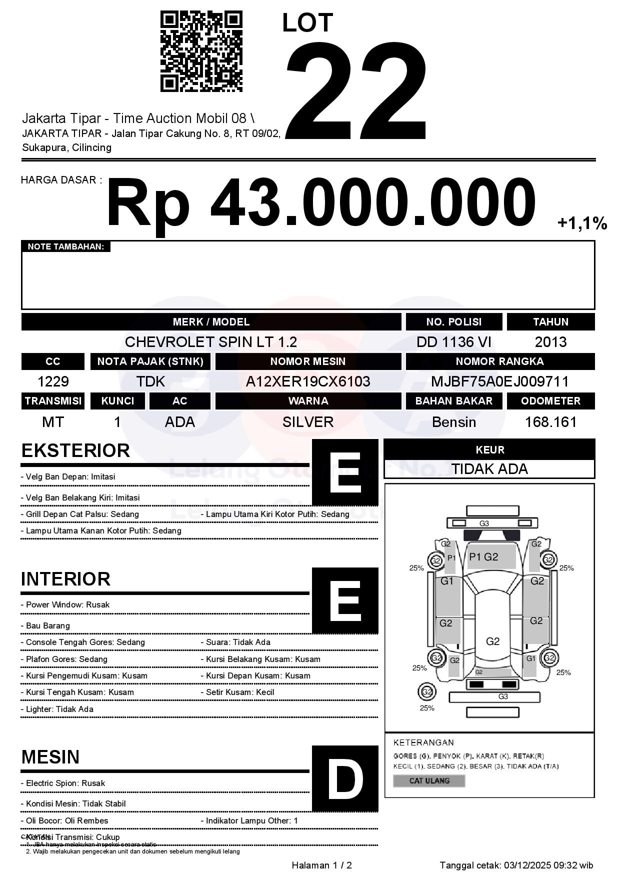 - Kondisi objek lelang dilelang apa adanya, baik kondisi fisik, mesin maupun legalitas kendaraan. Jika terdapat kekurangan/cacat baik yang terlihat maupun yang tidak terlihat, maka semua akan menjadi tanggung jawab/risiko Pemenang Lelang. Oleh karena itu, Pemenang Lelang melepaskan segala hak untuk menuntut dan/atau meminta ganti rugi atas hal tersebut kepada JBA.