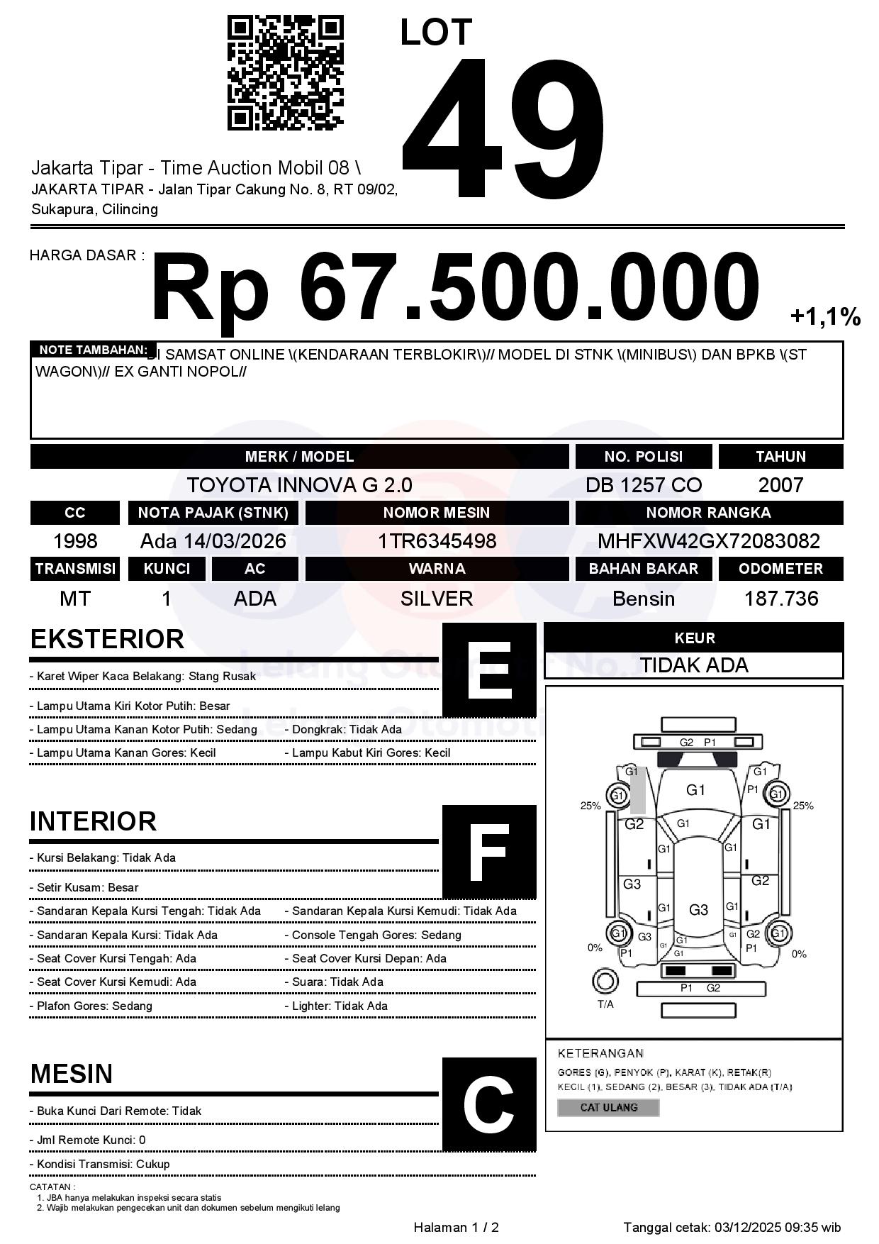 - Kondisi objek lelang dilelang apa adanya, baik kondisi fisik, mesin maupun legalitas kendaraan. Jika terdapat kekurangan/cacat baik yang terlihat maupun yang tidak terlihat, maka semua akan menjadi tanggung jawab/risiko Pemenang Lelang. Oleh karena itu, Pemenang Lelang melepaskan segala hak untuk menuntut dan/atau meminta ganti rugi atas hal tersebut kepada JBA.